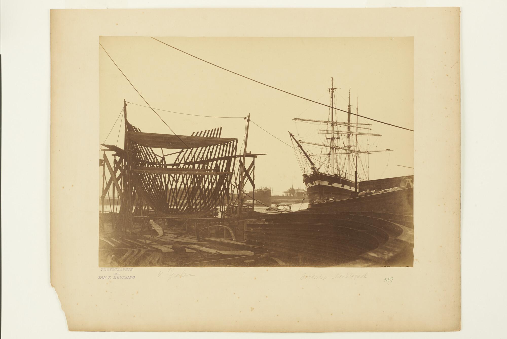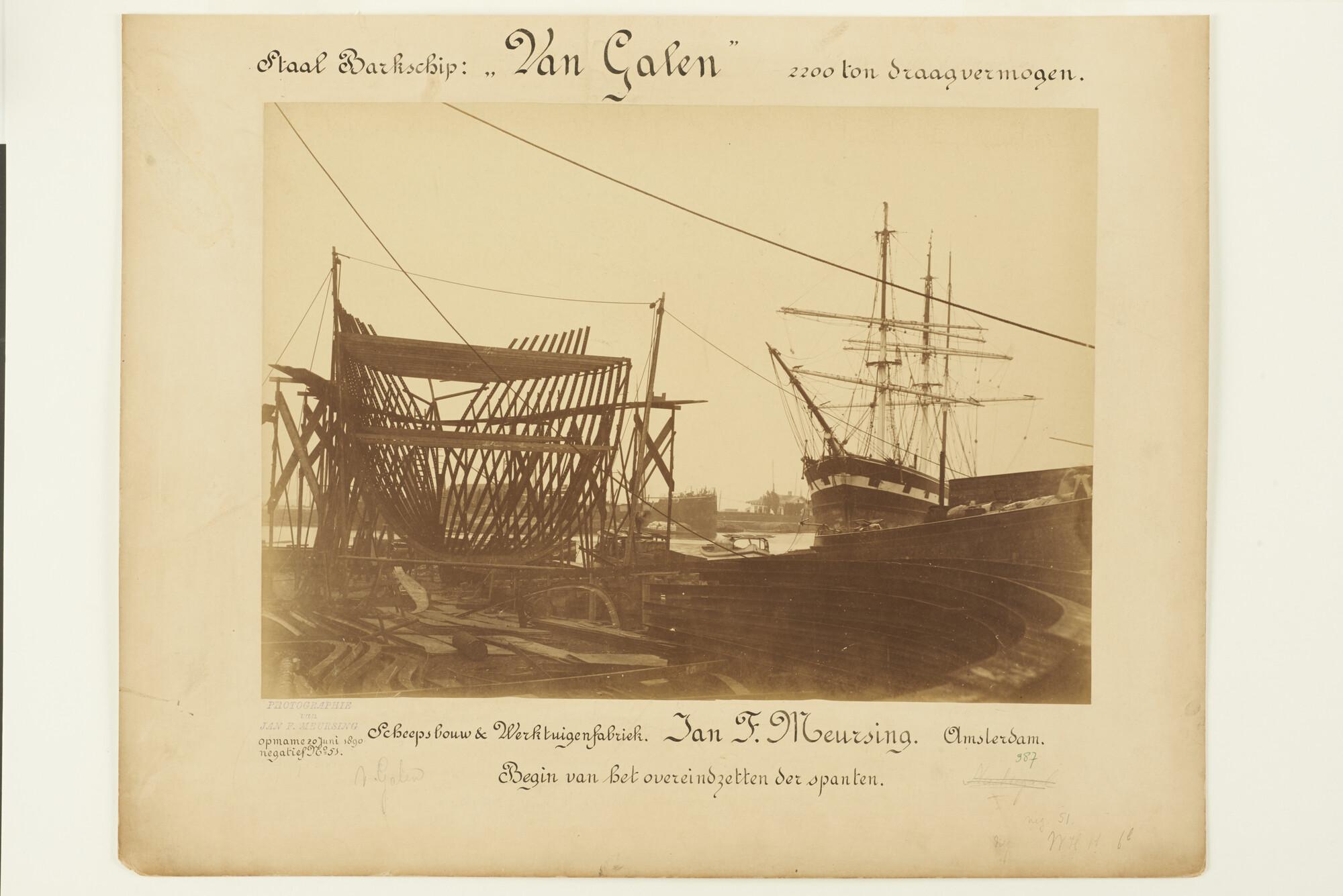Het stalen barkschip Van Galen in aanbouw op de werf De Nachtegaal te Amsterdam. Rechts ligt het barkschip Nachtegaal afgemeerd.