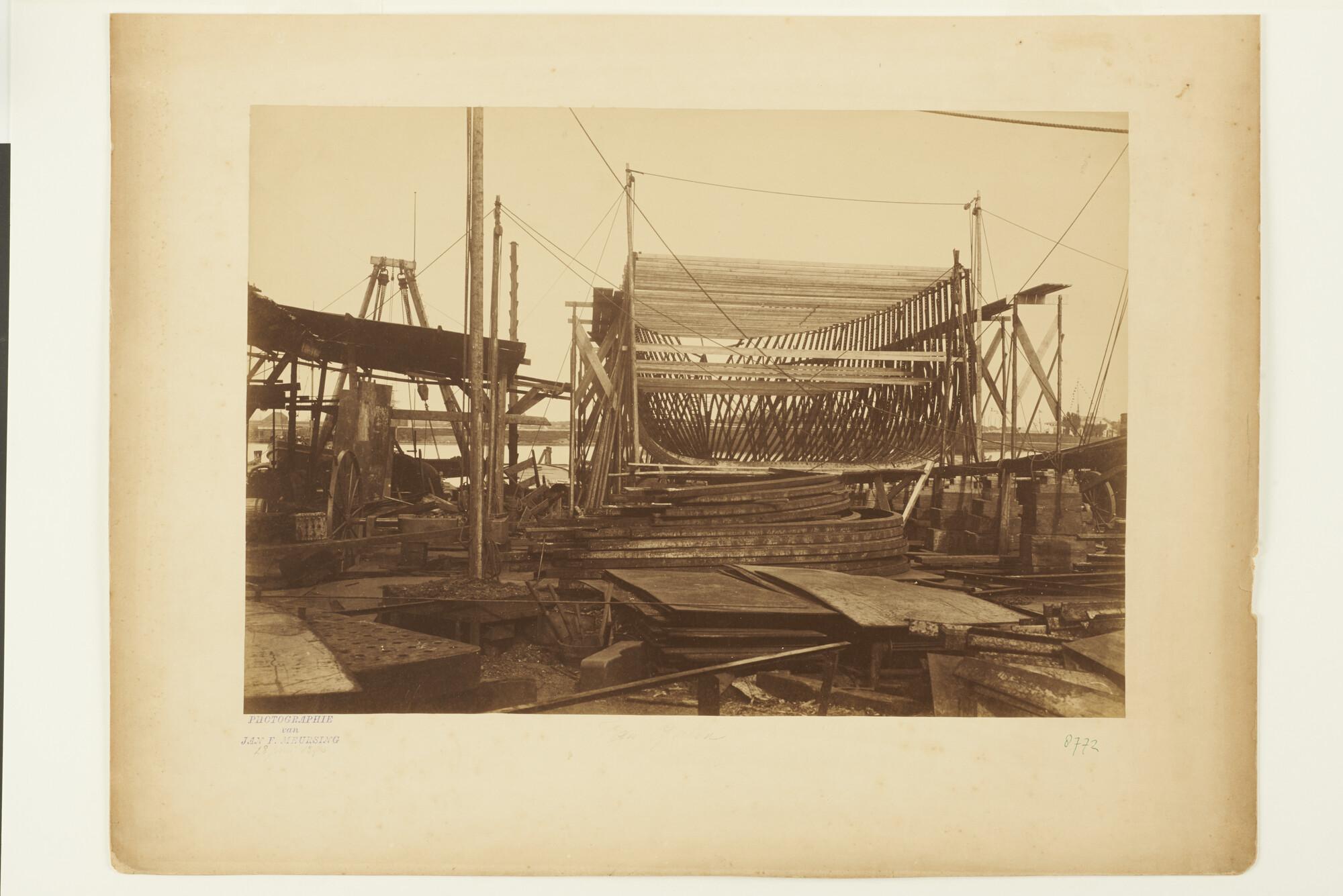 Het stalen barkschip Van Galen in aanbouw op de werf De Nachtegaal te Amsterdam