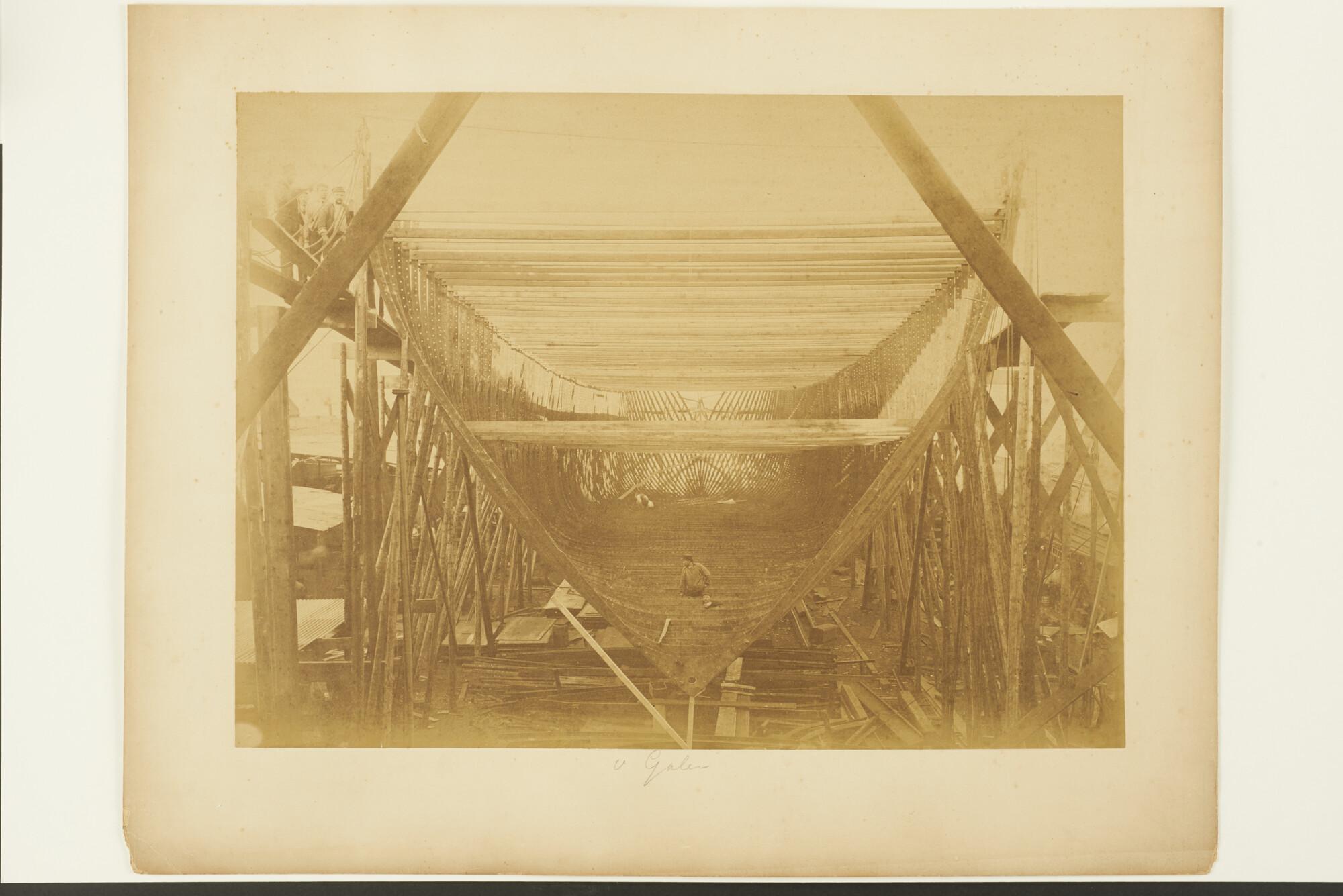 Foto's van het stalen barkschip Van Galen in aanbouw op de werf De Nachtegaal, bij het opzetten van de spanten, juli 1890.