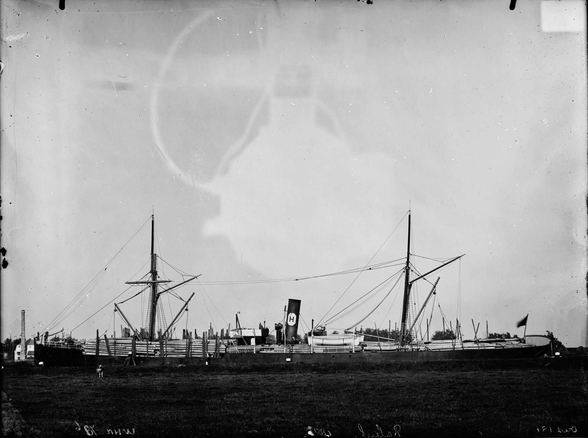 Glasnegatief van het schroefstoomschip Raleigh, afgemeerd in de haven van Amsterdam. Gebouwd in 1881 bij Caird & Pardee te Barrow in opdracht van J.Holmes & Sons te Exeter.