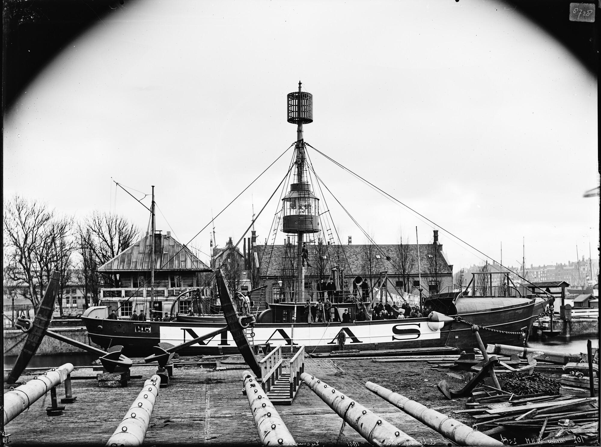 Negatieven van het lichtschip No. 5 Maas, zijaanzicht, gebouwd bij de Rijkswerf te Amsterdam, april 1891.