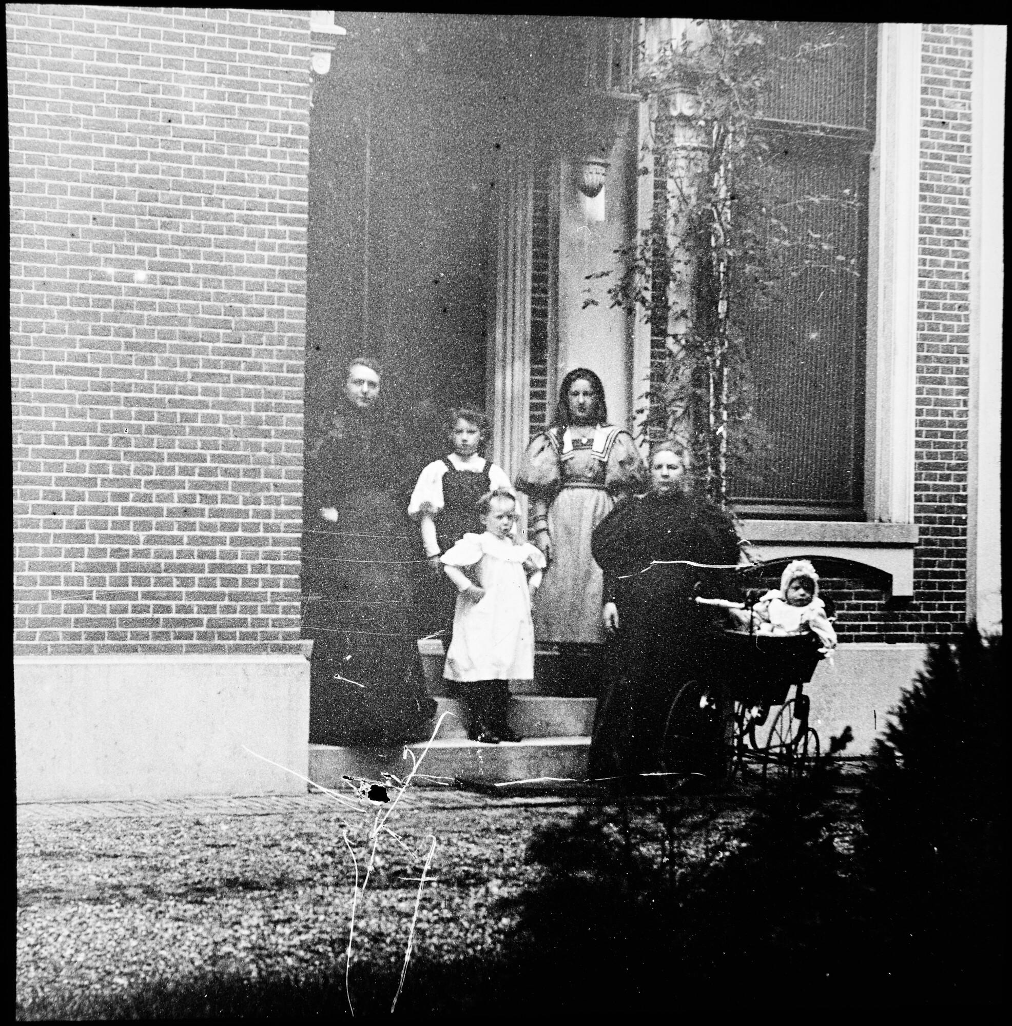 Portret van Anthonia Korthals Altes (1856 - 1930), echtgenote van Jan F. Meursing, met vlnr een onbekende dame, Catharina Fenna Carlotta (1891), Metta Johanna (1888), Maria (1885) en zittend in de kinderwagen Wicher Hooite (1895). Lantaarnplaatje.