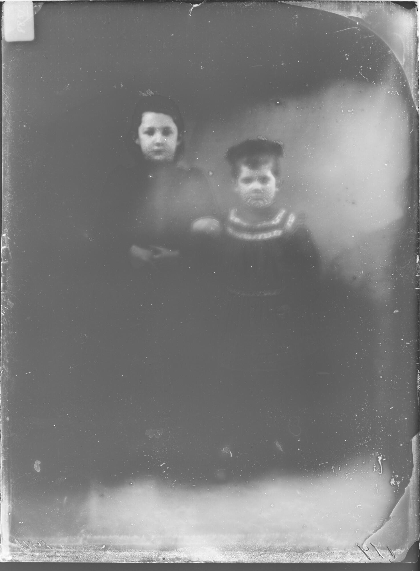 Negatief van een portret van vermoedelijk Maria (1885), met kat in haar armen, en Metta Johanna Meursing (1888), dochters van Jan Frederick Meursing en Anthonia Korthals Altes.