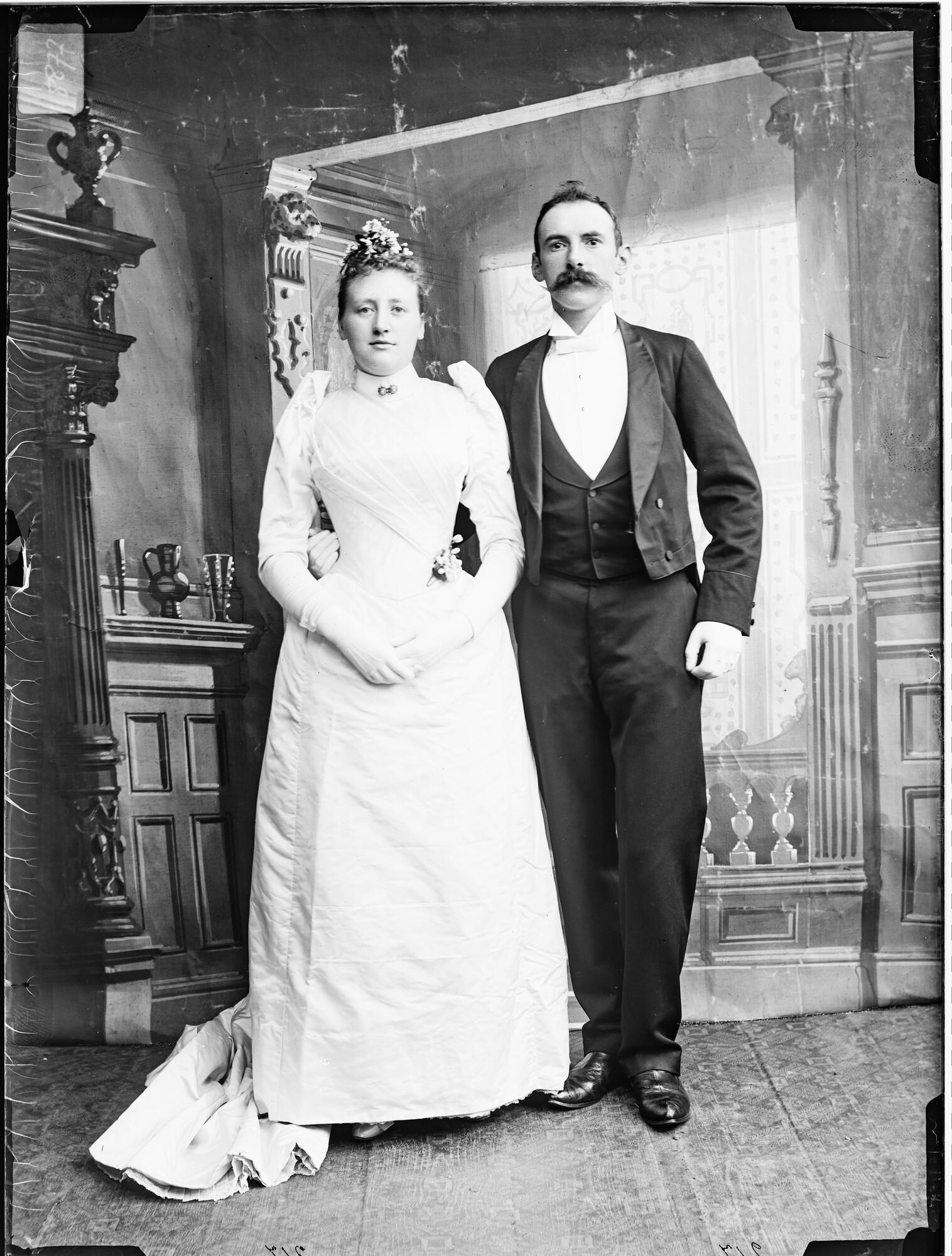 Glasnegatief van een trouwportret (vermoedelijk) van Everhardus Johannes Korthals Altes (1866 - 1924) en Afina Theresia de Flines (1870 - 1945). De bruidegom heeft zijn arm om de middel van zijn bruid geslagen.