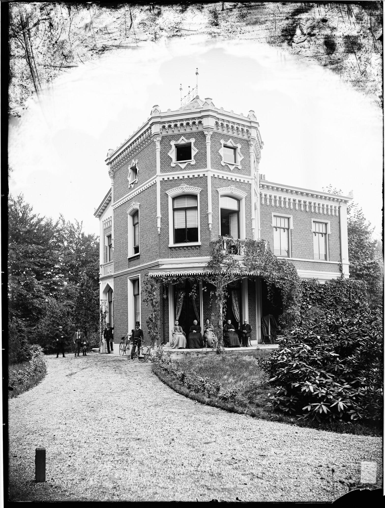 Glasnegatief van het familieportret van het gezin van Jan Philip Korthals Altes en Maria ter Haarr, de dames gezeten op het platje achter en de heren terzijde van het ouderlijk huis te Baarn, omstreeks 1894.