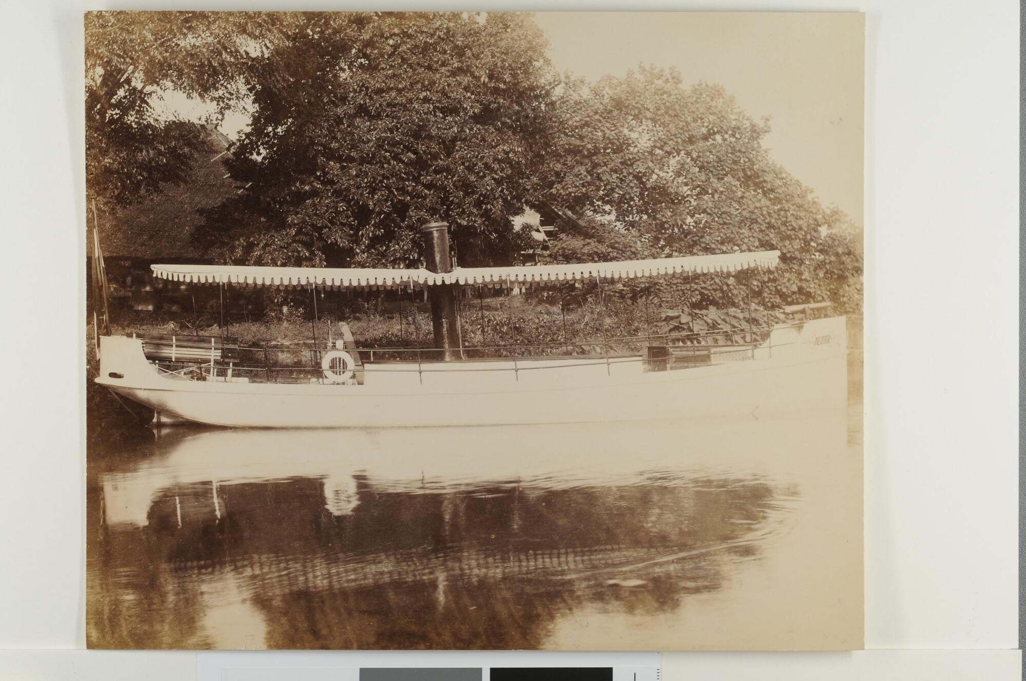 Het gewestelijk vaartuig 'Marie', dienst doende als ambulance-vaartuig, ligt afgemeerd aan de wal bij het Marine Etablissement Soerabaja, 1893