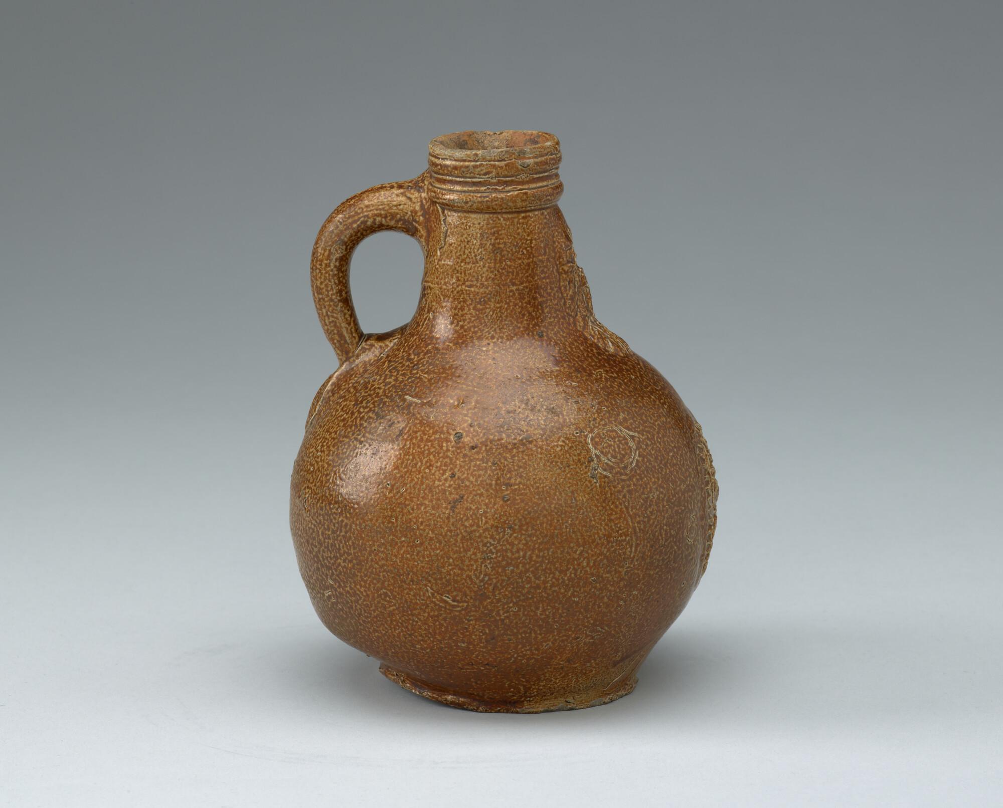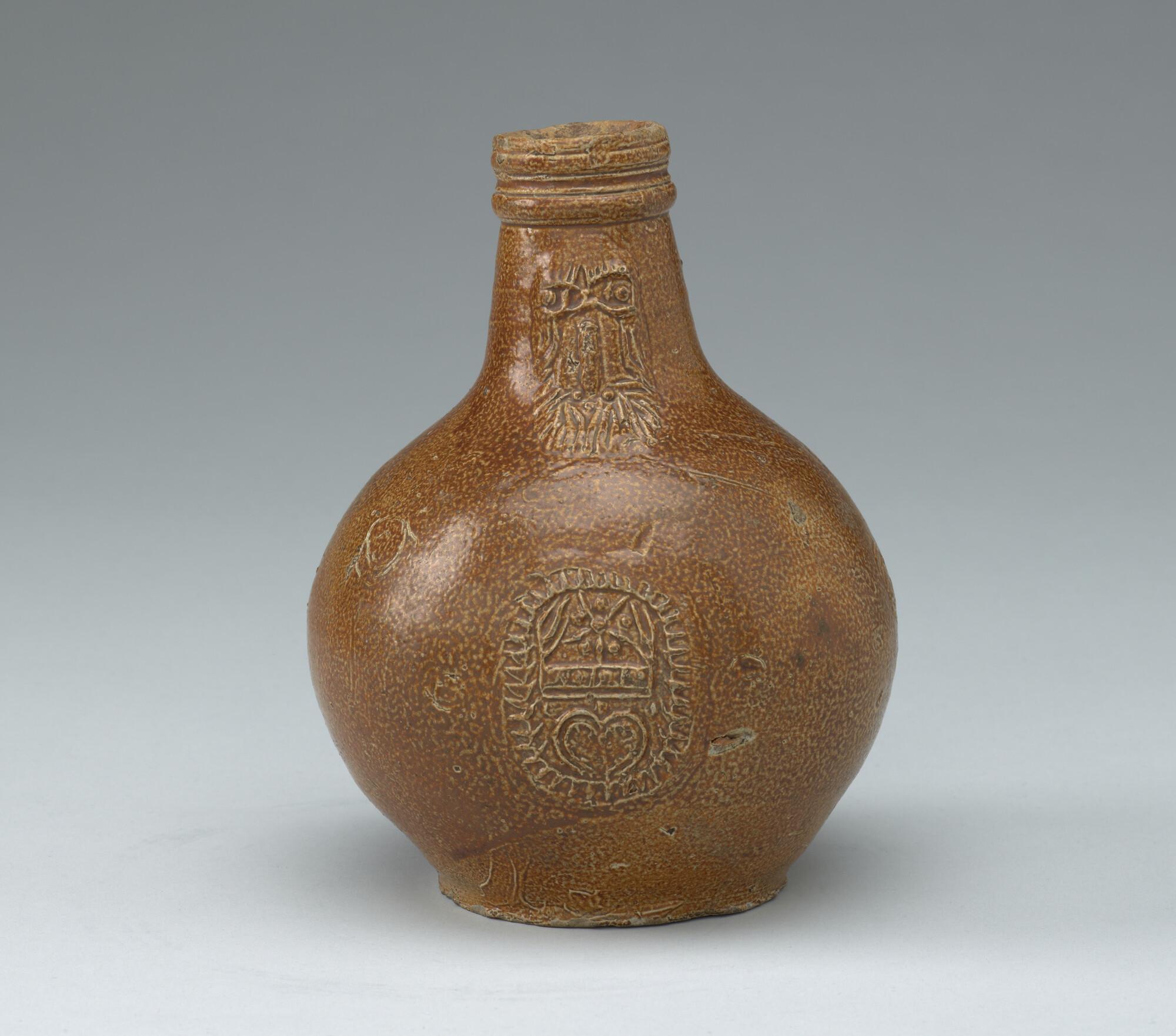 Kruik, zgn. 'baardmankruik' met fantasiewapen.