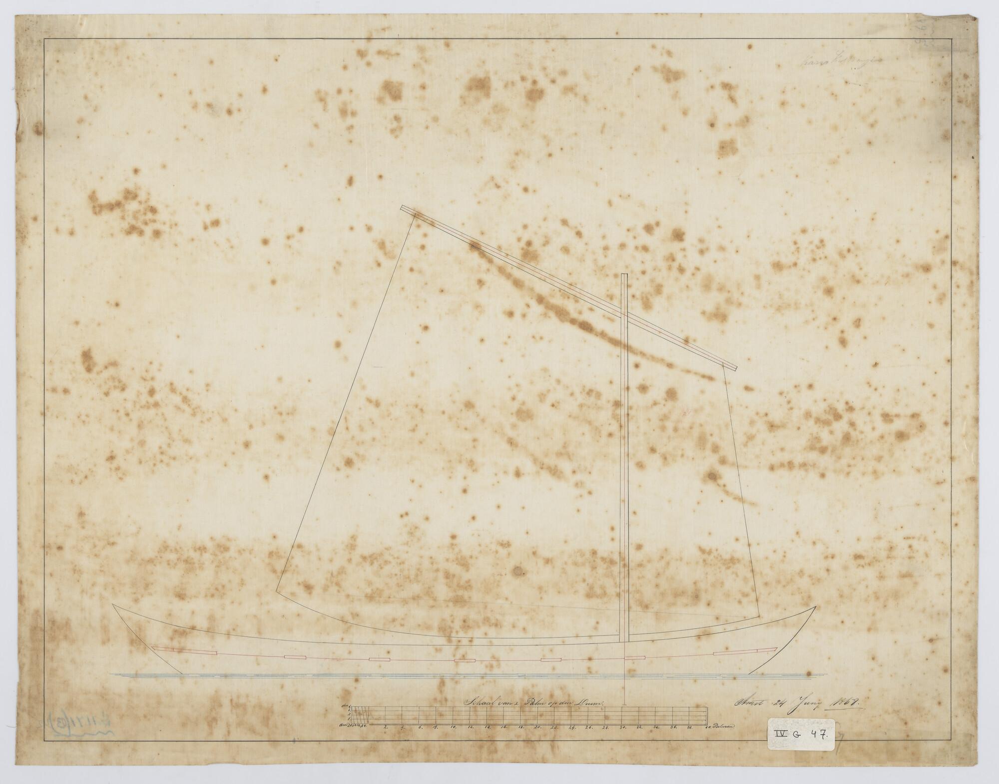 Zijaanzicht van een kano (met emmertuig) 1868.