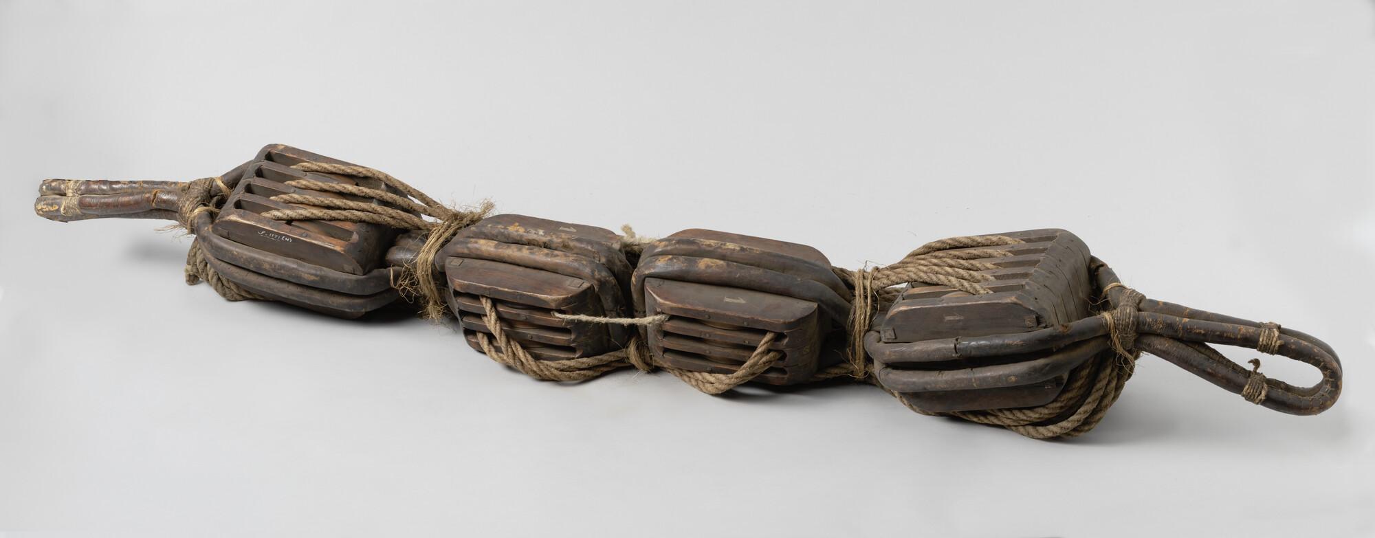 Iepenhouten blokken met pokhouten schijven, ijzeren nagel. Vier stuks. Gestropt met touw waaromheen leer. Gijn van Matthijssen. Eén blok vijfschijfs, één blok vierschijfs, twee blokken drieschijfs. Een gestel gemerkt met gekruiste ankers.