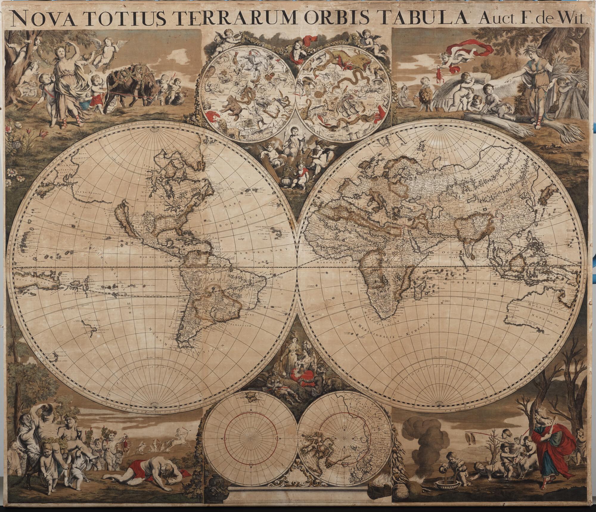 Met de hand gekleurde op linnen gemonteerde wereldkaart in twee halfronden op 6 bladen door Frederik de Wit, in de eerste staat. Rond de twee halfronden van de wereldkaart zijn de vier seizoenen afgebeeld, en tevens kleinere kaarten van de sterrenbeelden van het Noordelijk en het Zuidelijk Halfrond en Poolkaarten van de Noord- en Zuidpool. ...