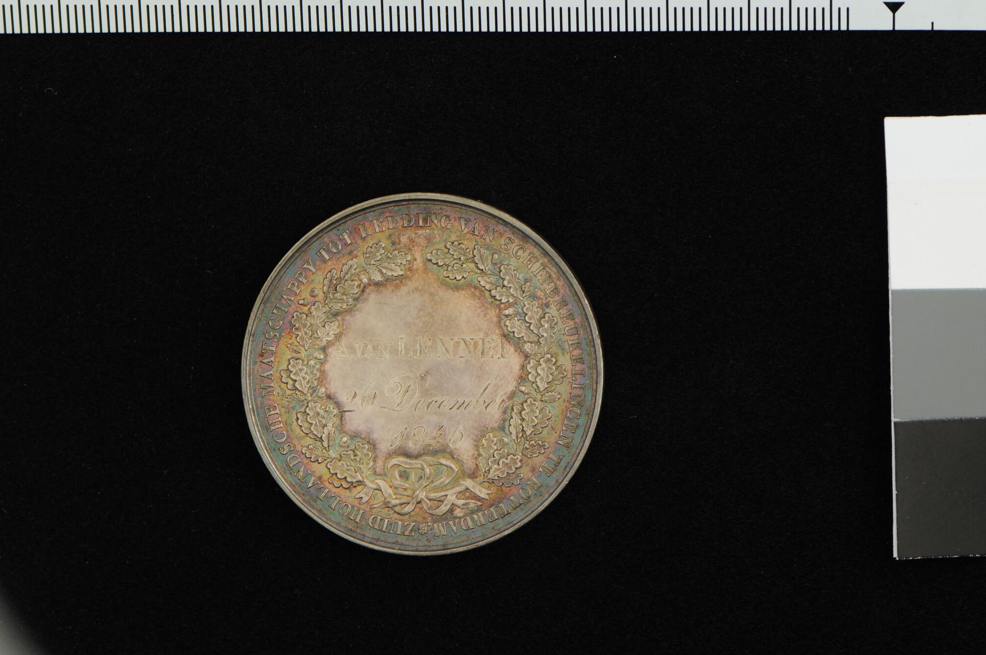 Zilveren medaille van de Zuid-Hollandsche Maatschappij tot Redding van Schipbreukelingen. Uitgereikt aan luitenant-ter-zee A. van Lennep naar aanleiding van de redding van de bemanning van het Spaanse brik "Antonio", door het korvet Zr. Ms. "Juno" voor de Portugese kust op 26 december 1846.