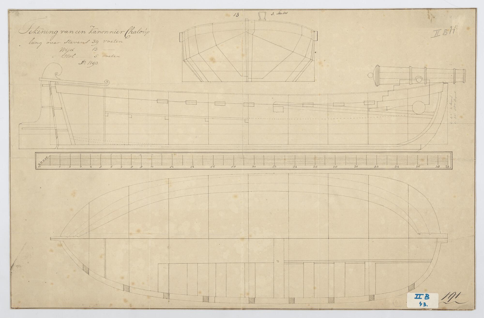 Zijaanzicht, verticale langsdoorsnede, met voorin een stuk geschut op rolpaard, vooraanzicht, achteraanzicht, bovenaanzicht, onderaanzicht, spantenraam, met knikspanten van een kanonneersloep 1793. Afmetingen van het schip 39 x 13 x 5 voet.