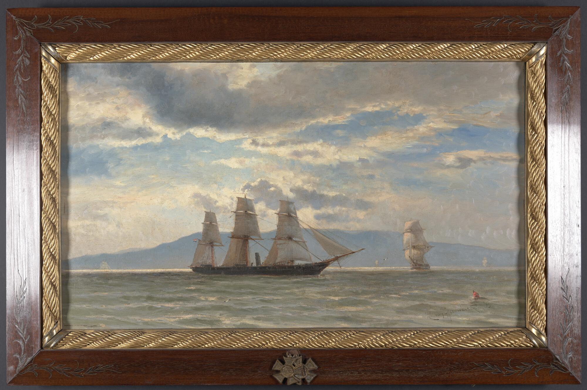 Zr.Ms. schroefstoomschip 1ste klasse Zilveren Kruis. Met hangende aparte lijst met fotografische portretten van de bemanning.