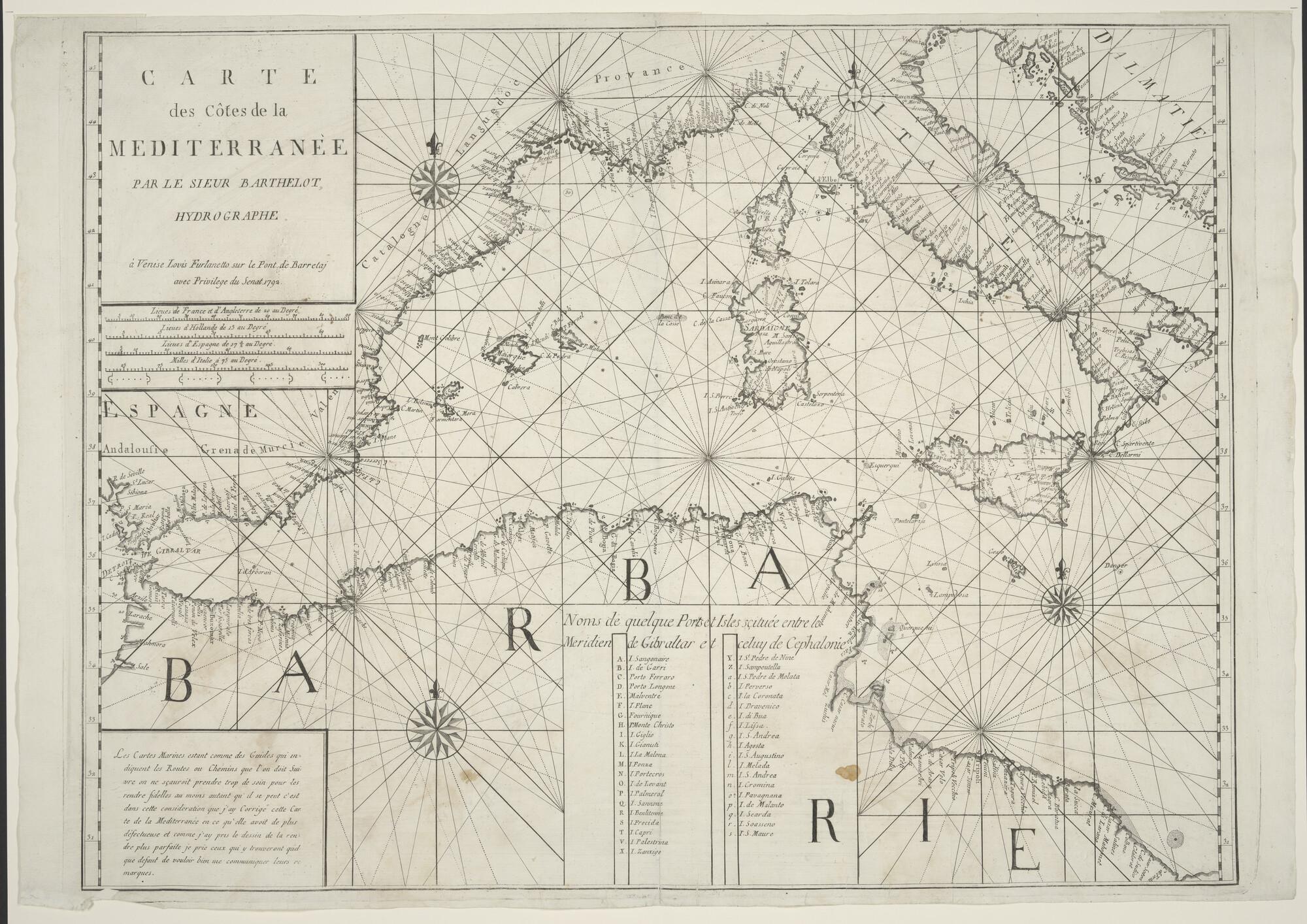 Kaart van de Middellandse Zee door Barthelot. Uitgave Lodovico Furlanetto, Venetie, 1792 (schaal 1 op 3.500.000).