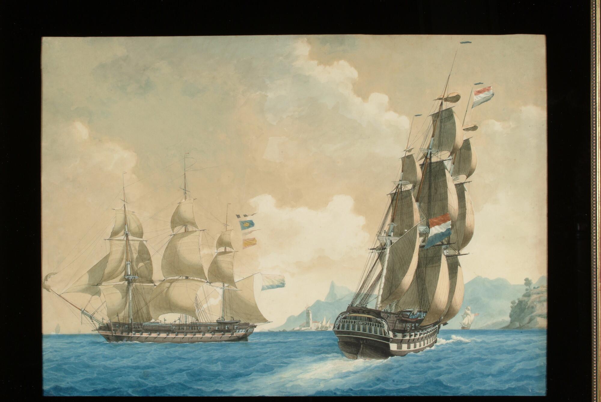Twee Nederlandse oorlogsfregatten voor een bergachtige kust, vermoedelijk in de Middellandse Zee (Brest?).