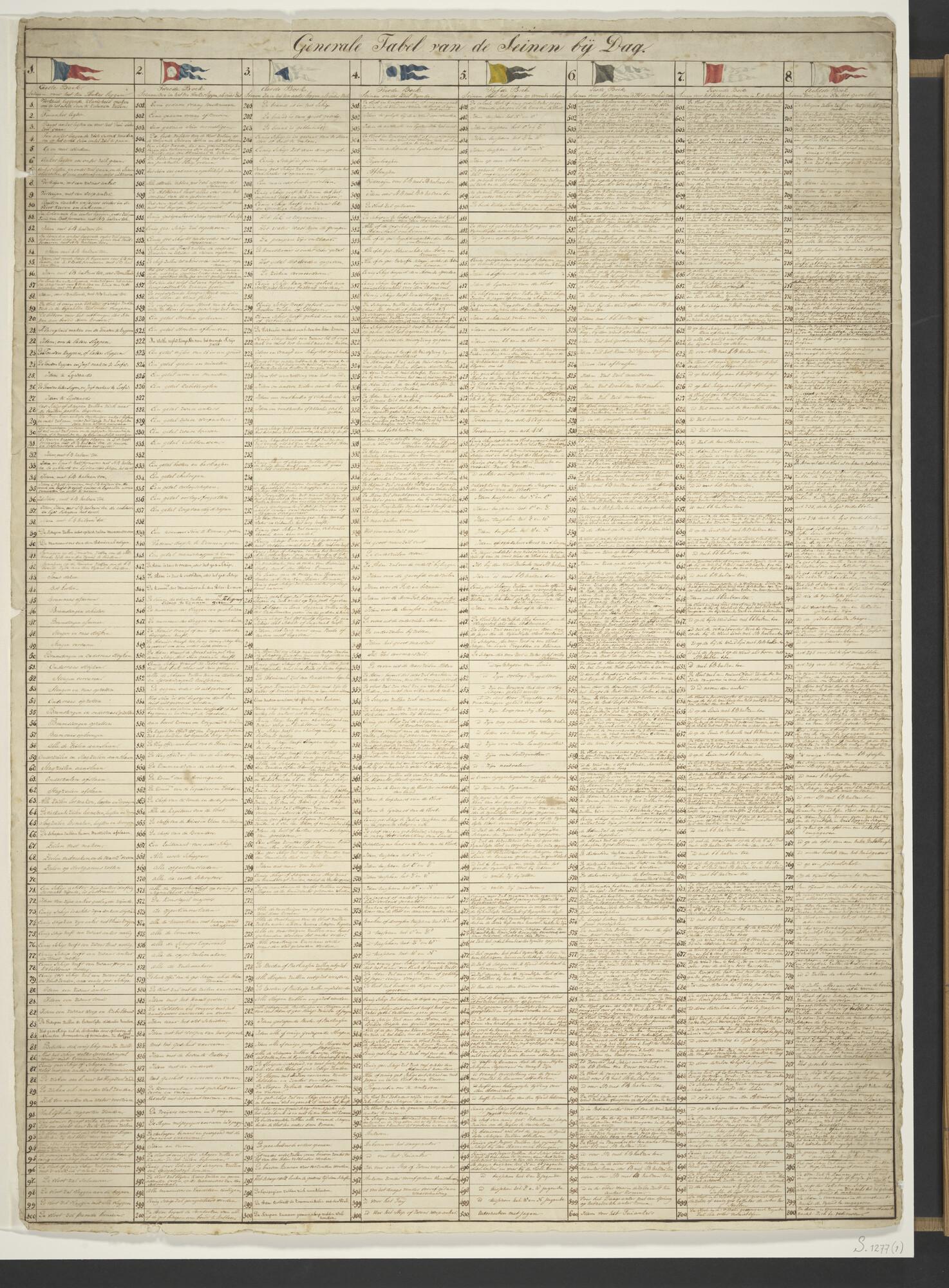 Overzicht van de Nederlandse seinvlaggen, genummerd 1 - 8, en de bijbehorende nummercodes 1 - 800.
