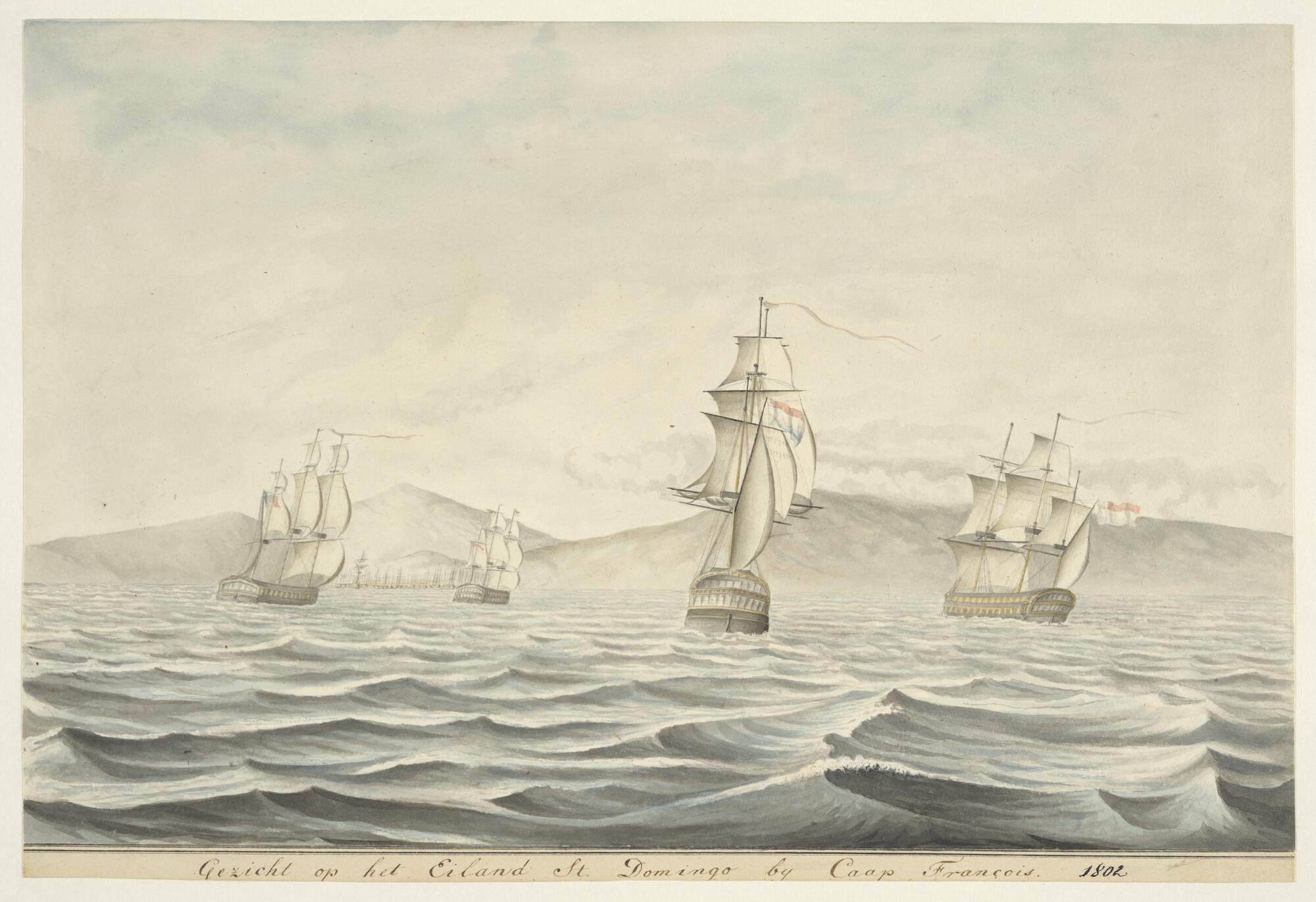 Een eskader Nederlandse oorlogsschepen op de rede van Santo Domingo bij Kaap François.