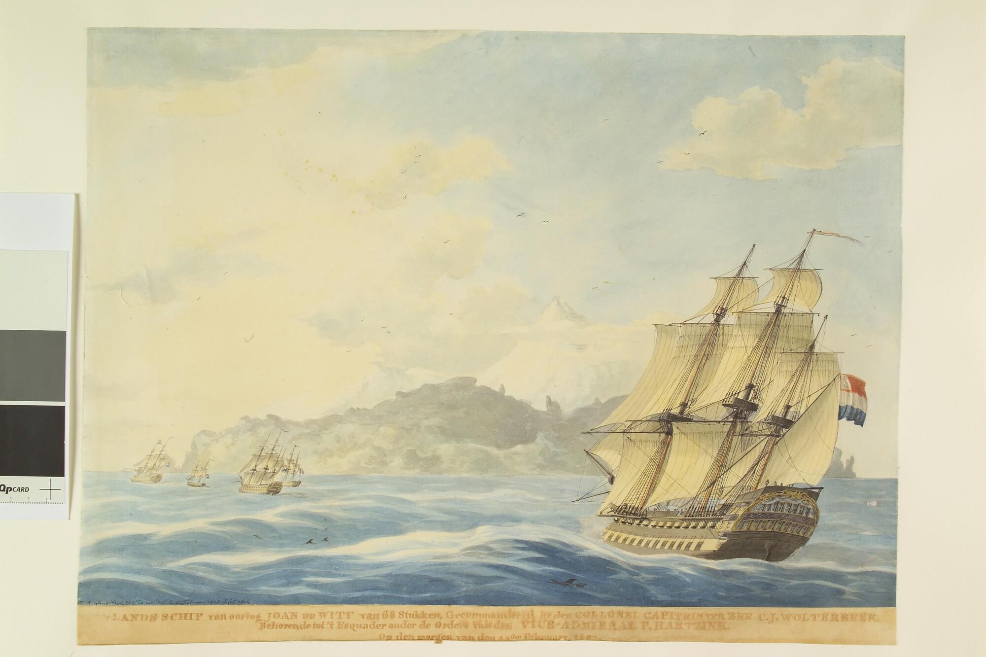 Aankomst van het eskader van admiraal Pieter Hartsinck bij Tenerife op 25 februari 1802. In het midden het linieschip 'Joan de Witt'.