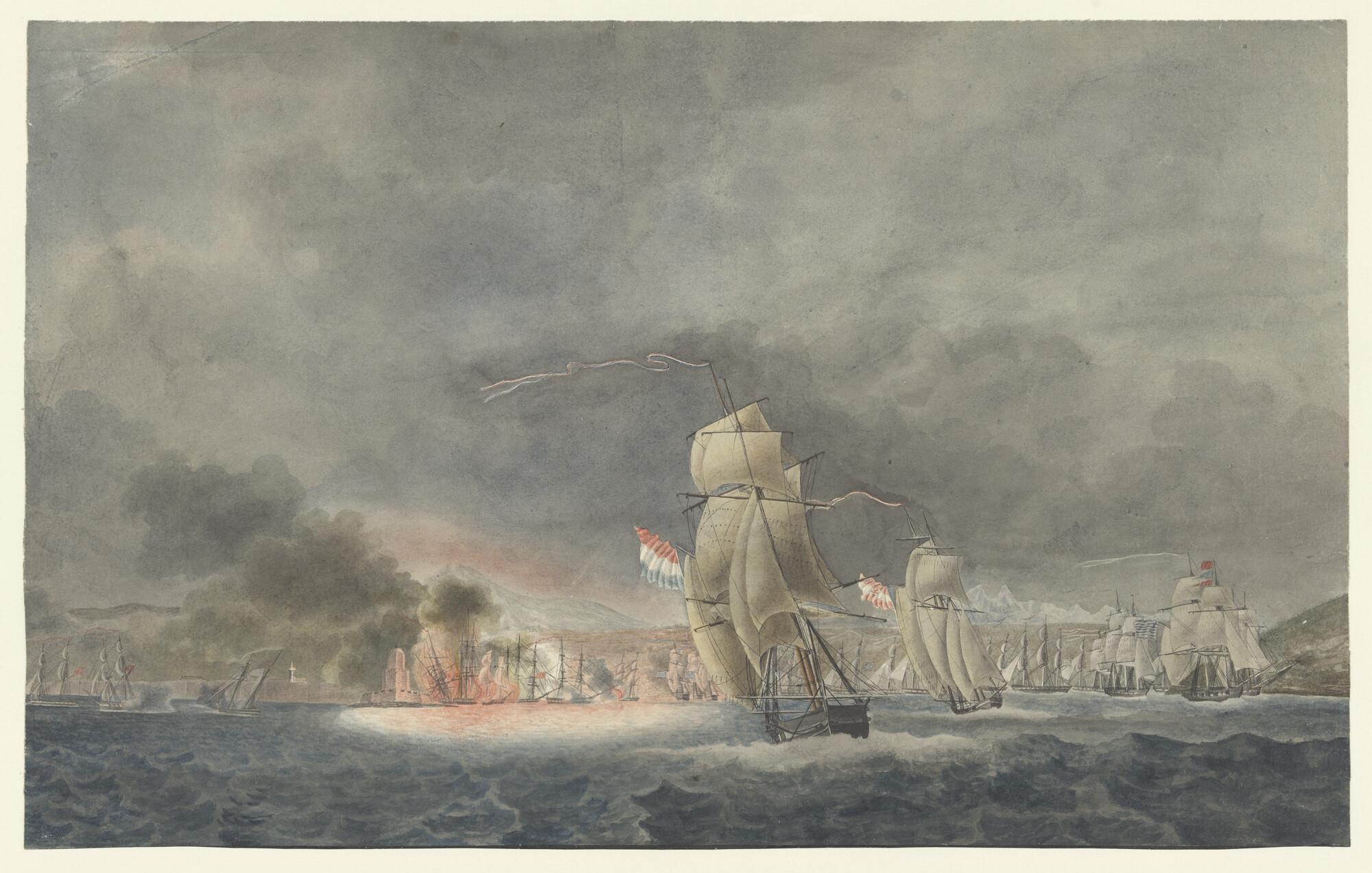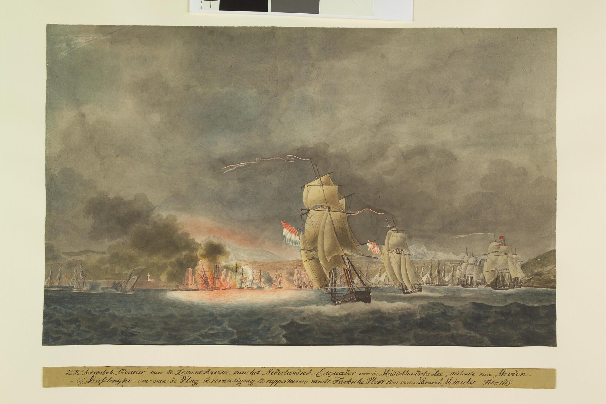 Brik Zr.Ms. "Courier" wegzeilende van Modon met het bericht van de vernietiging van de Turkse vloot, februari 1825.