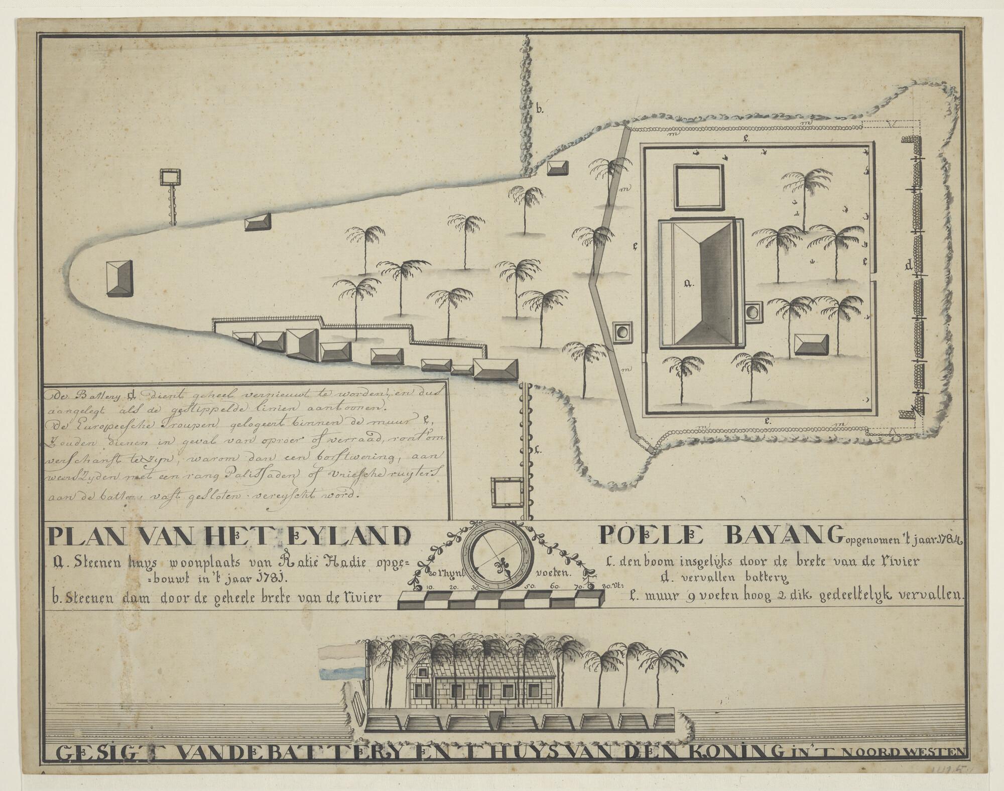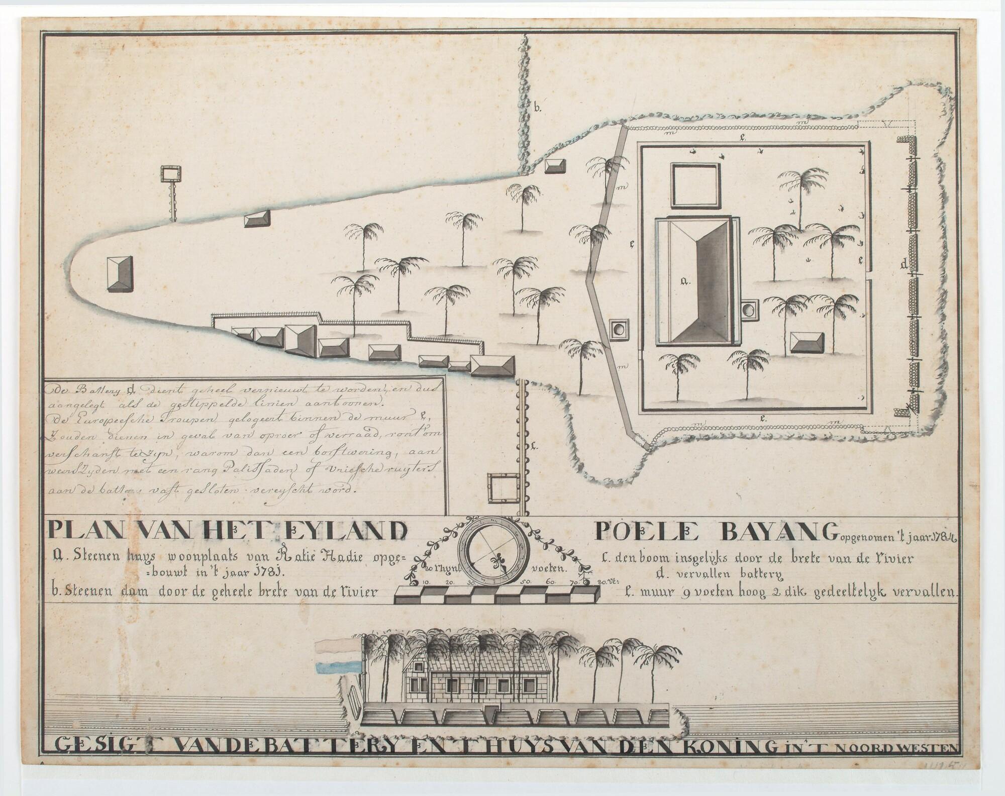 Manuscriptkaart van het eiland Poele Bayang: plattegrond van de batterij en het huis van de koning