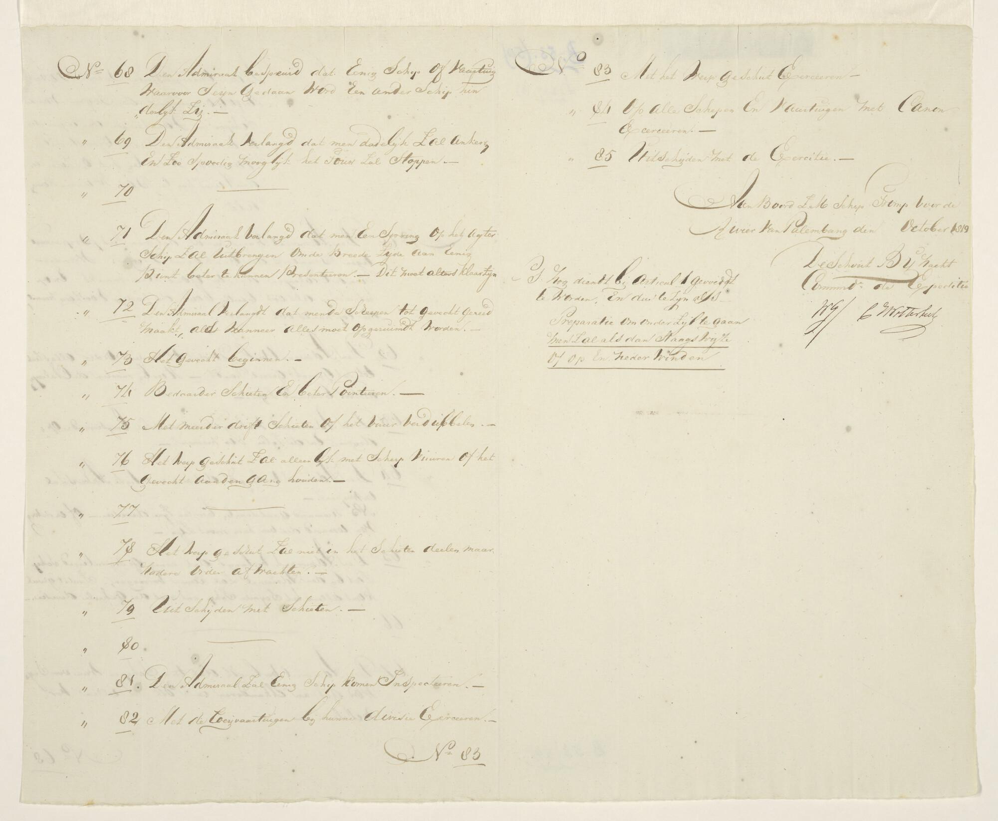 Verklarende tekst bij de Seintabel voor de transportschepen op weg naar Palembang. Aanvullende seinen door Schout bij Nacht C.J. Wolterbeek a/b van Zr.Ms. "Tromp", ivm het opzeilen van de rivier: genummerd 61 - 85.
