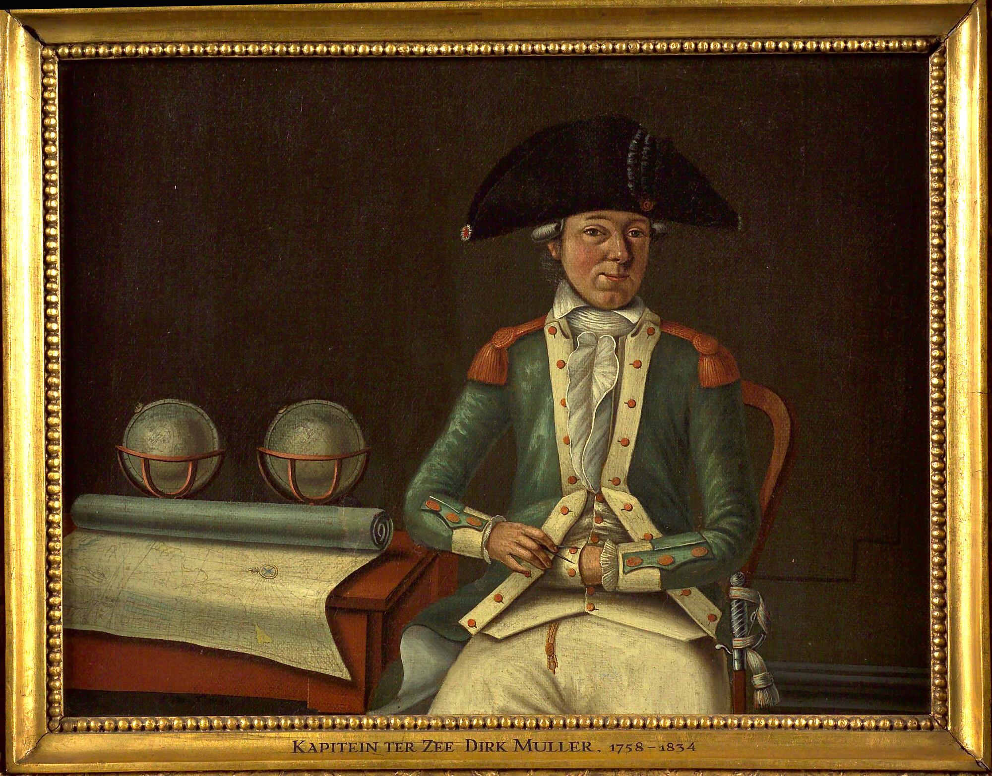 Portret van VOC-kapitein Dirk Muller, in het kapiteinsuniform van de Vereenigde Oost-Indische Compagnie. Hij zeilde in 1788 met het Zeepaard naar Azië en keerde drie jaar laten met het schip Beverwijk weer terug. Muller zit aan een tafel met daarop twee globes en een deels opgeslagen zeekaart.