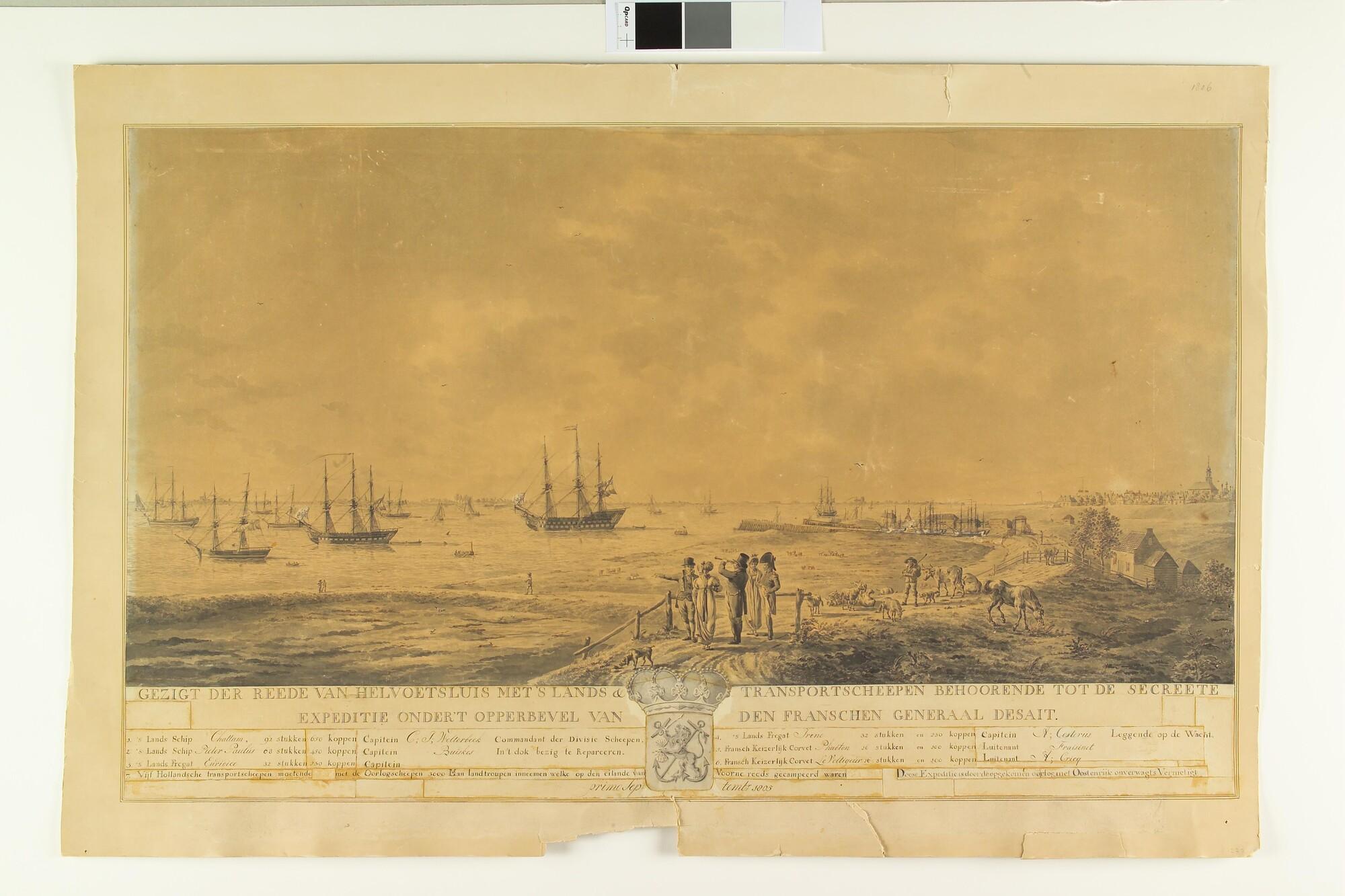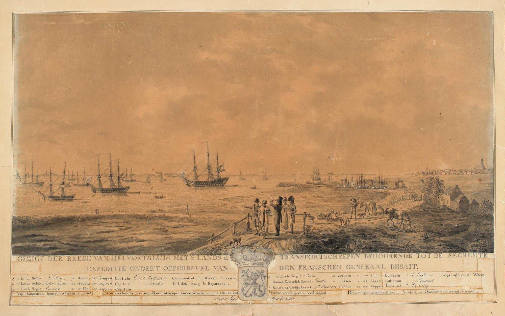 Hollandse en Franse oorlogsschepen, deel uitmakend van de Secreete Expeditie tegen Engeland, op de rede van Hellevoetsluis. Op de voorgrond op de dijk een gezelschap van drie heren en twee dames, waarvan een heer een verrekijker vasthoudt.