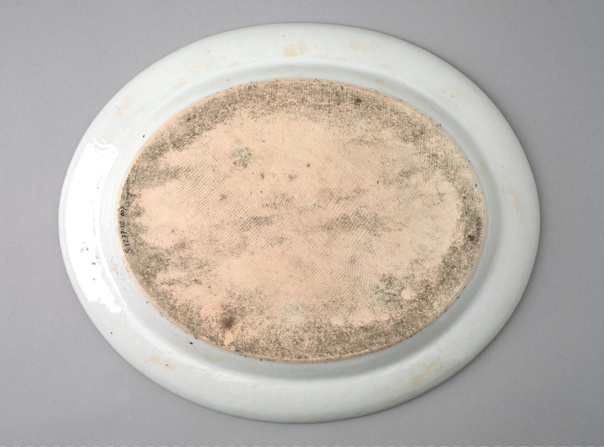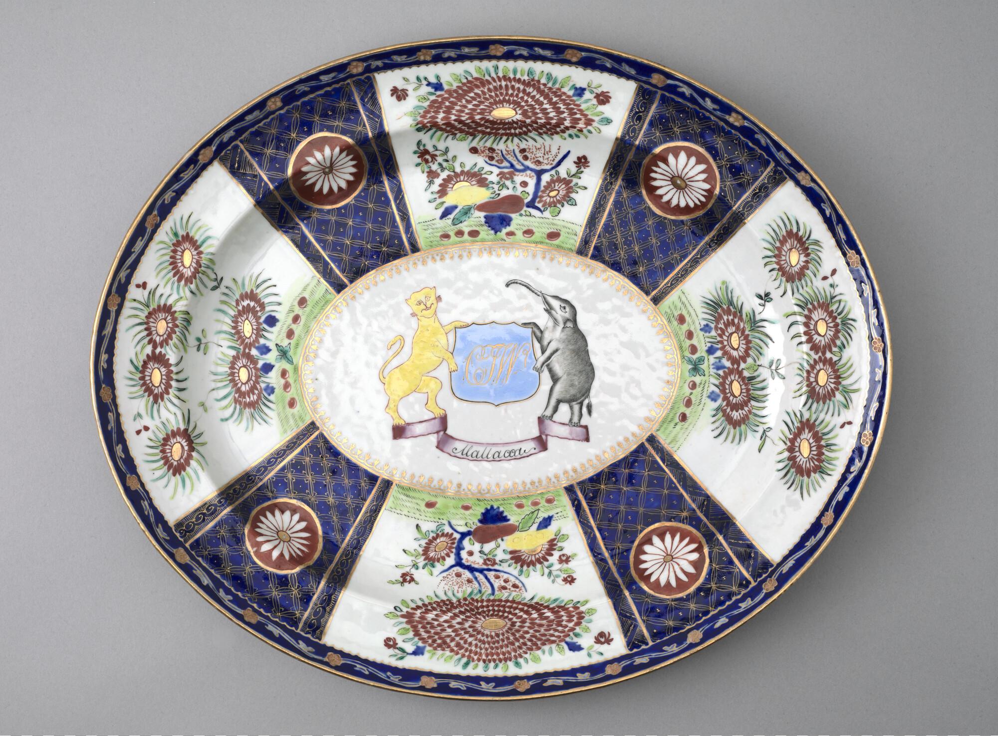Grote, ovale schaal van Chinees porselein. Gedecoreerd met een polychroom wapenschild gedragen door een tijger en een olifant. In het wapenschild het monogram "CJW" en daaronder het opschrift "Malacca".