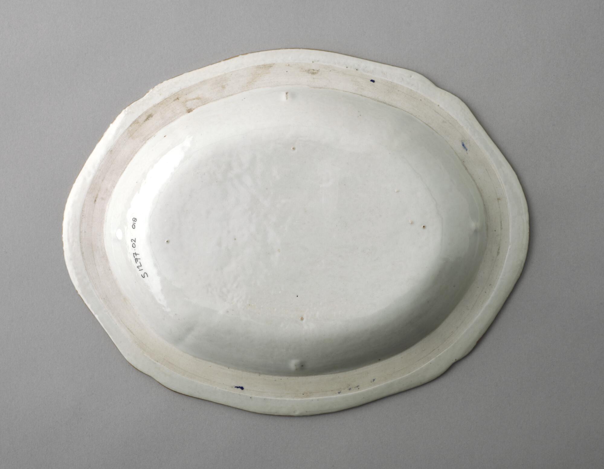 Kleine, ovale schaal met geschulpte mondrand van Chinees porselein. Gedecoreerd met een polychroom wapenschild gedragen door een tijger en een olifant. In het wapenschild het monogram "CJW" en daaronder het opschrift "Malacca".