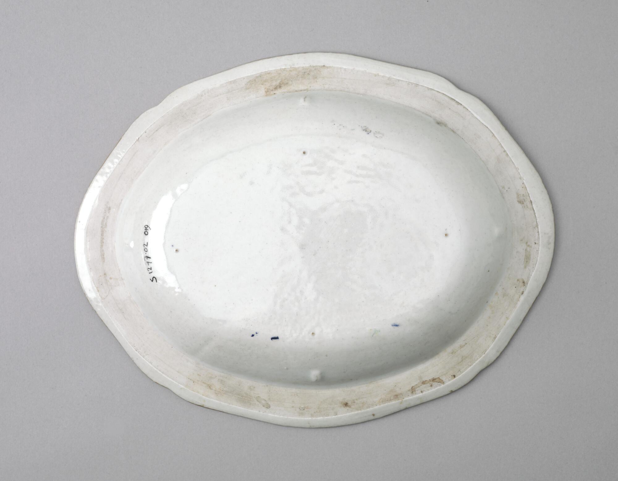 Kleine, ovale schaal gedecoreerd met polychroom wapenschild