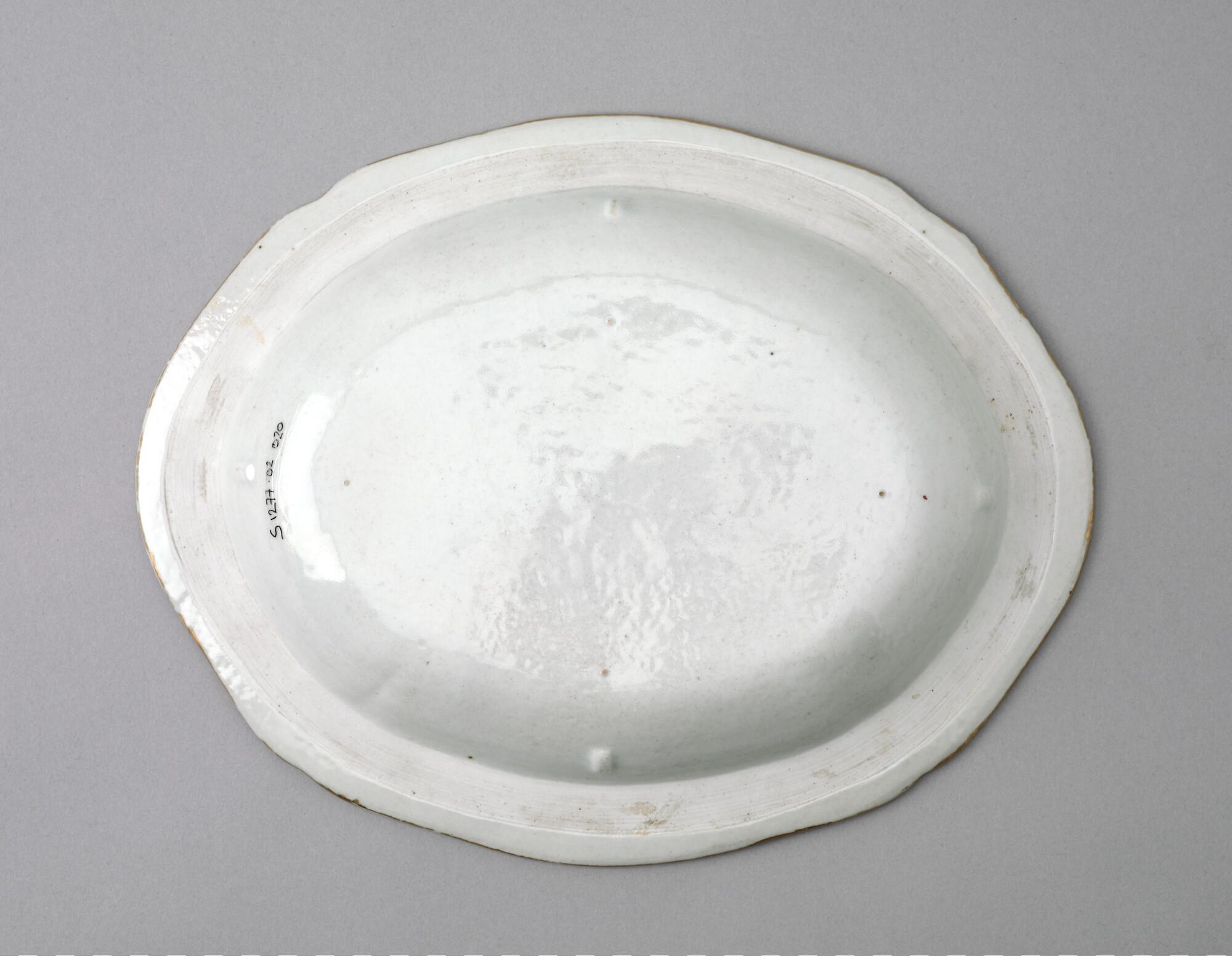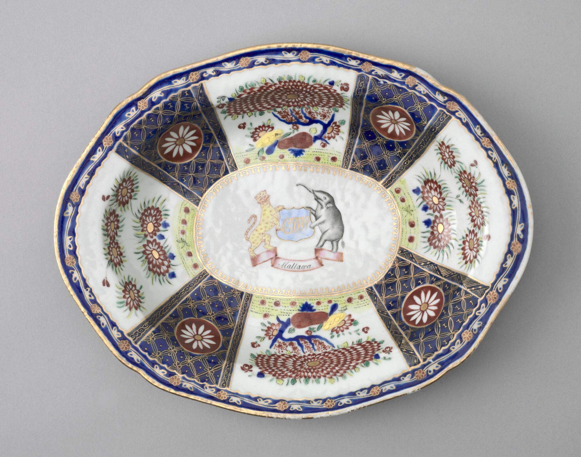 Kleine, ovale schaal met geschulpte mondrand van Chinees porselein. Gedecoreerd met een polychroom wapenschild gedragen door een tijger en een olifant. In het wapenschild het monogram "CJW" en daaronder het opschrift "Malacca".