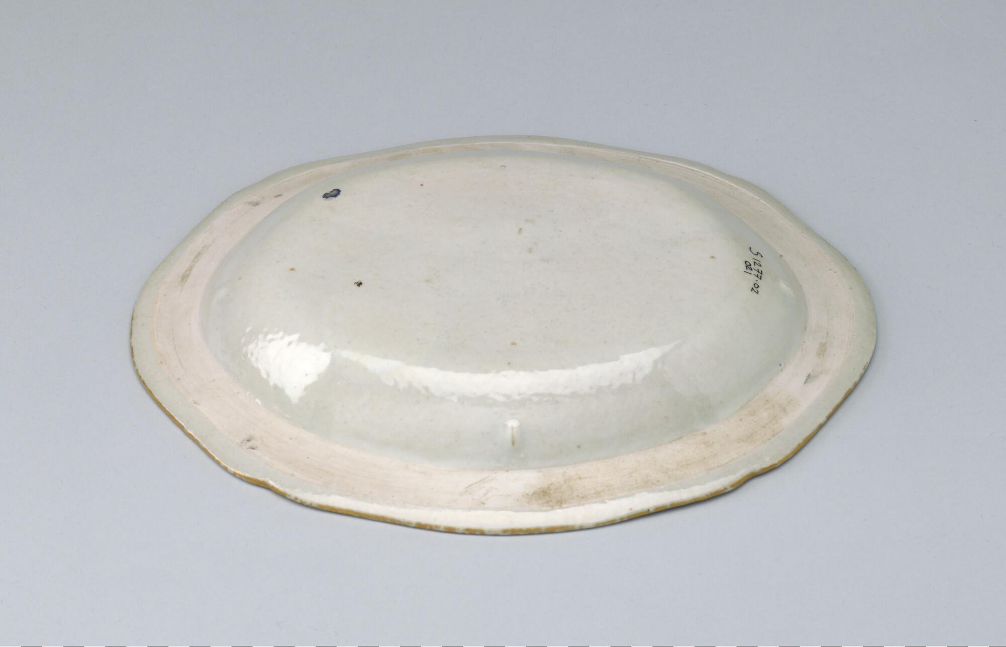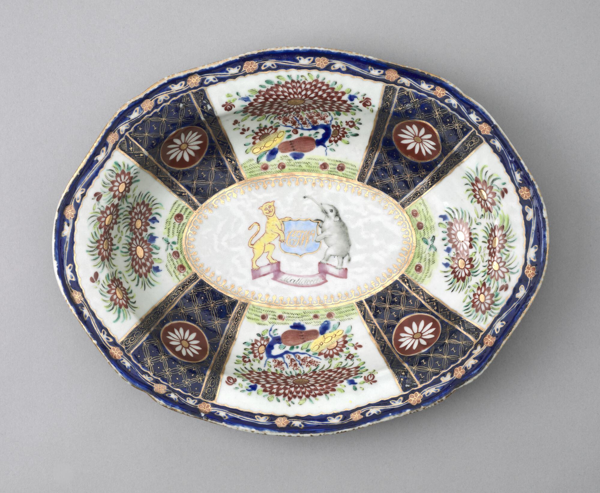 Kleine, ovale schaal met geschulpte mondrand van Chinees porselein. Gedecoreerd met een polychroom wapenschild gedragen door een tijger en een olifant. In het wapenschild het monogram "CJW" en daaronder het opschrift "Malacca".