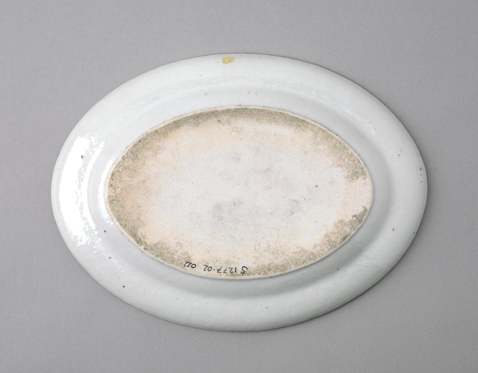 Kleine, ovale schaal gedecoreerd met polychroom wapenschild
