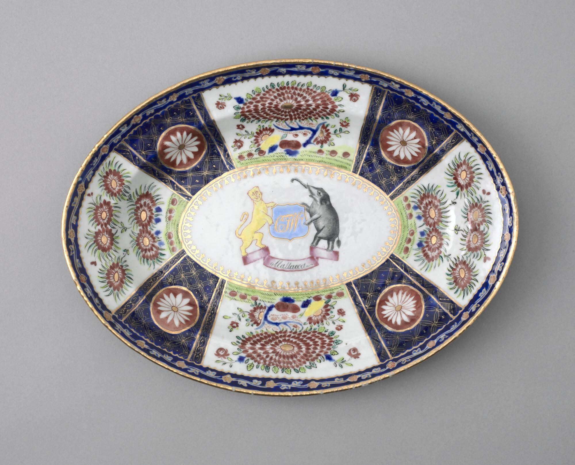 Kleine, ovale schaal van Chinees porselein. Gedecoreerd met een polychroom wapenschild gedragen door een tijger en een olifant. In het wapenschild het monogram "CJW" en daaronder het opschrift "Malacca".