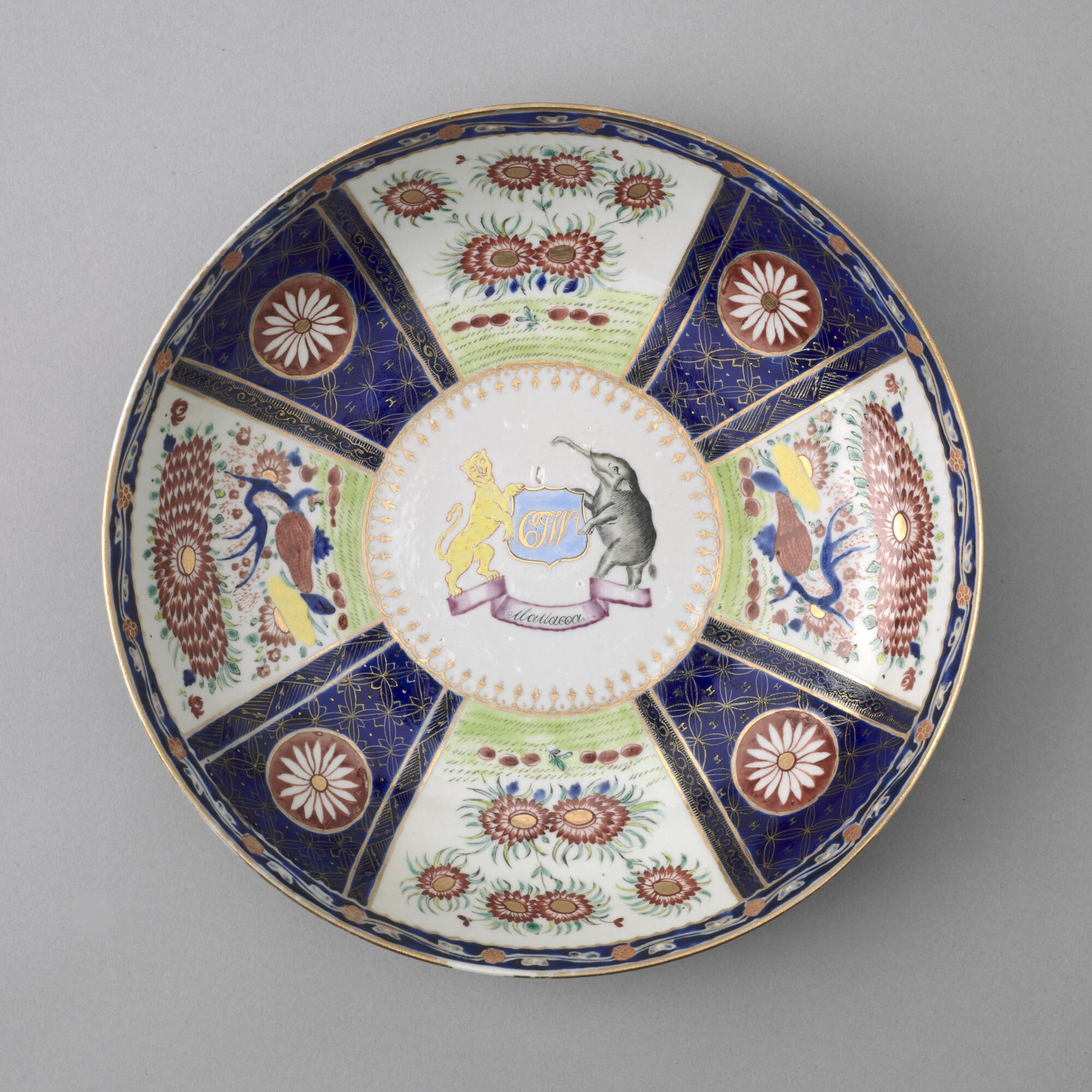 Ronde schaal van Chinees porselein. Gedecoreerd met een polychroom wapenschild gedragen door een tijger en een olifant. In het wapenschild het monogram "CJW" en daaronder het opschrift "Malacca".