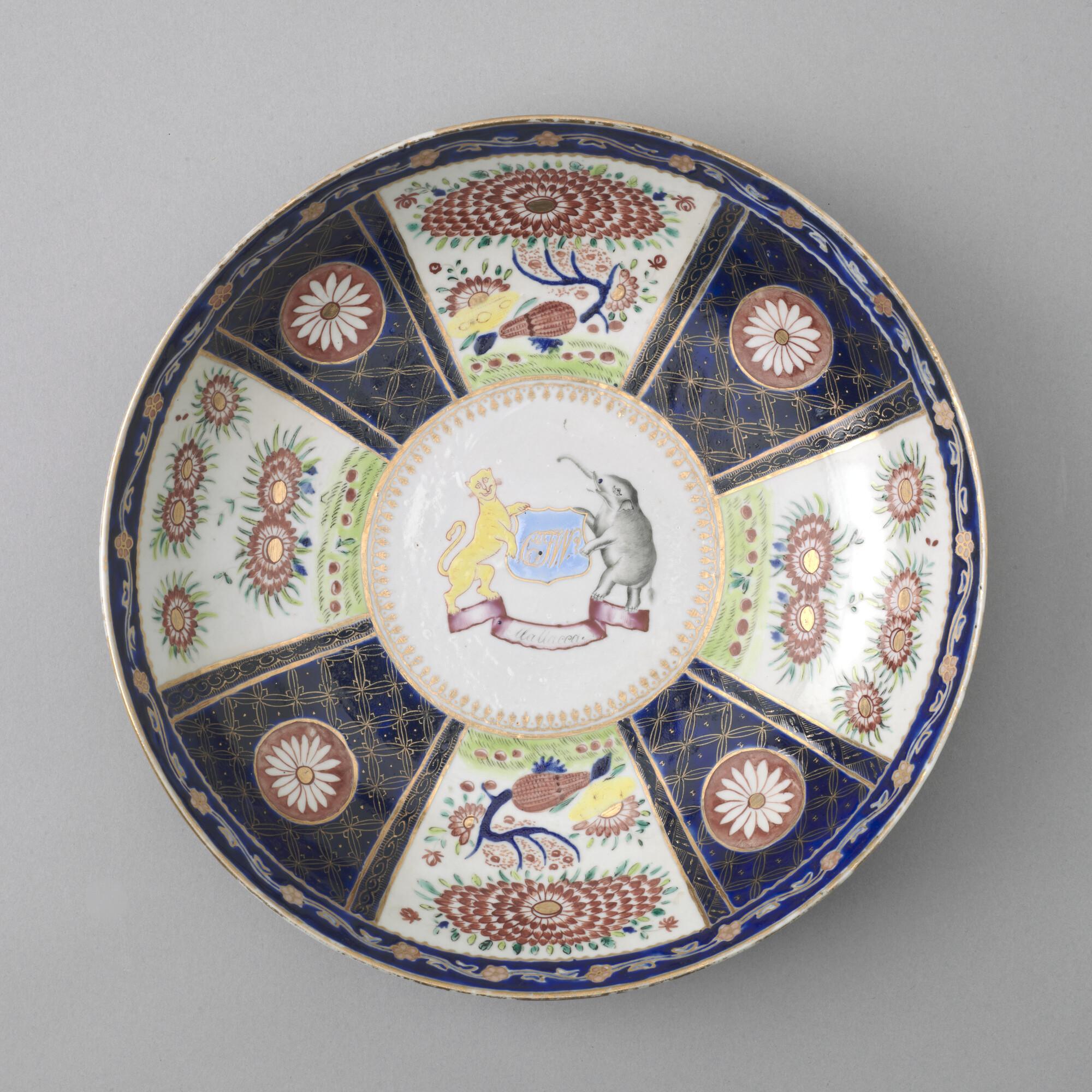 Ronde schaal van Chinees porselein. Gedecoreerd met een polychroom wapenschild gedragen door een tijger en een olifant. In het wapenschild het monogram "CJW" en daaronder het opschrift "Malacca".
