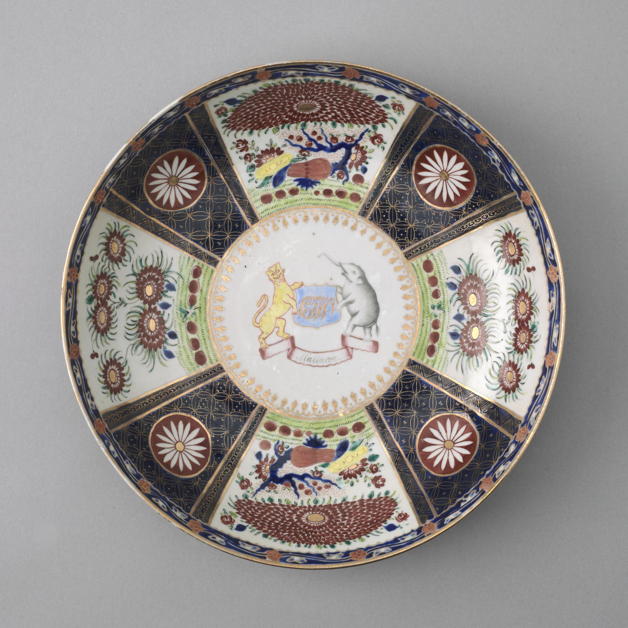 Ronde schaal van Chinees porselein. Gedecoreerd met een polychroom wapenschild gedragen door een tijger en een olifant. In het wapenschild het monogram "CJW" en daaronder het opschrift "Malacca".