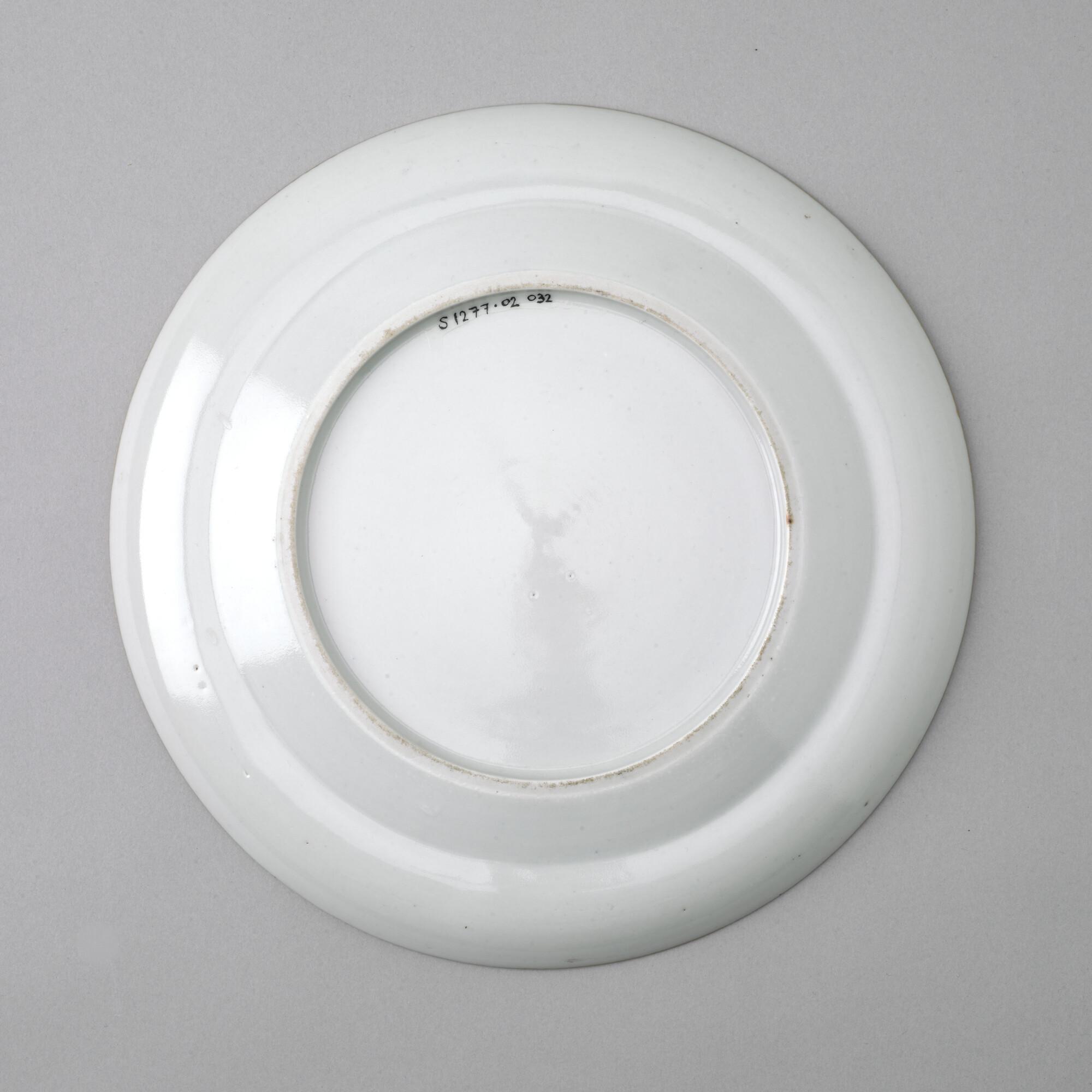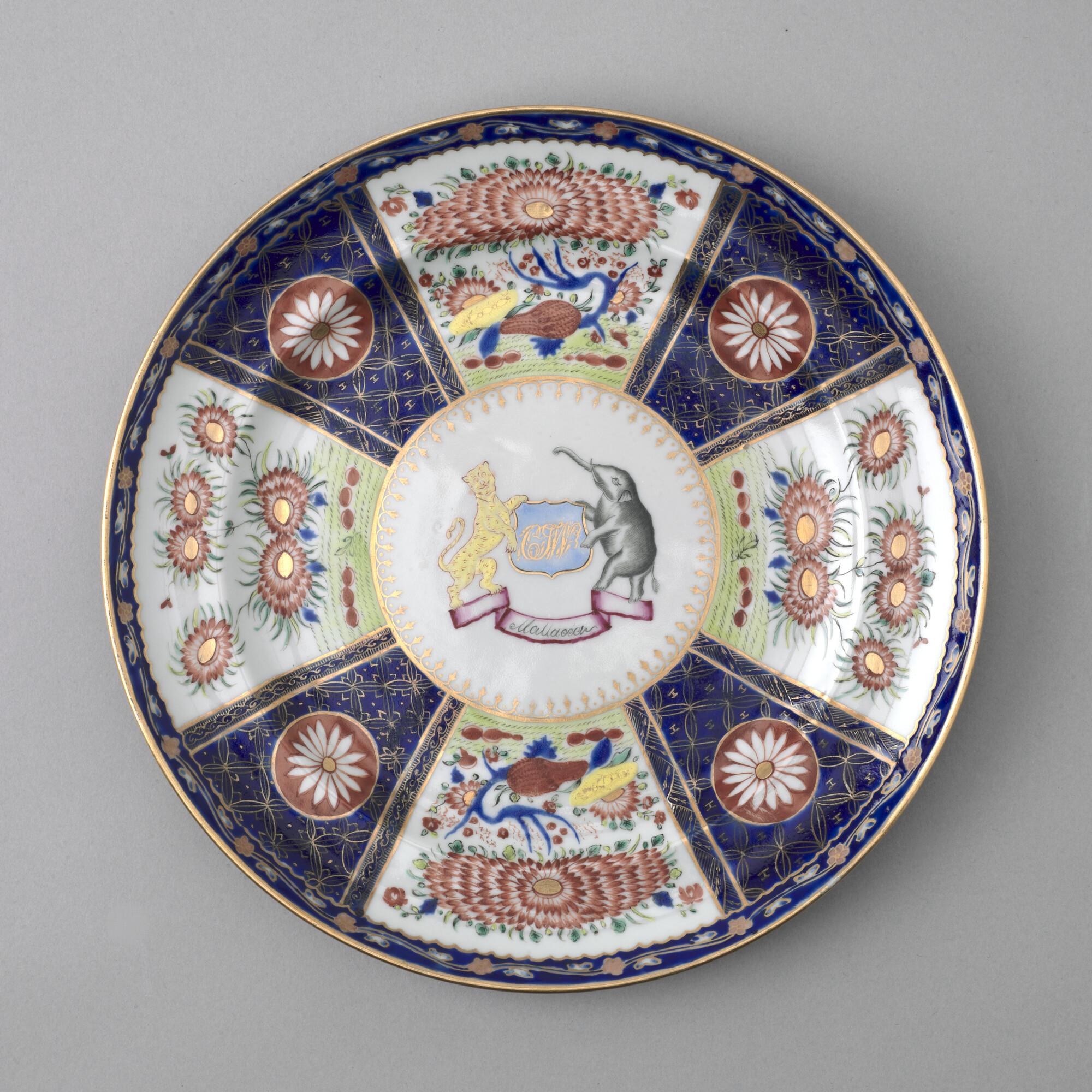 Groot, plat bord van Chinees porselein. Gedecoreerd met een polychroom wapenschild gedragen door een tijger en een olifant. In het wapenschild het monogram "CJW" en daaronder het opschrift "Malacca".