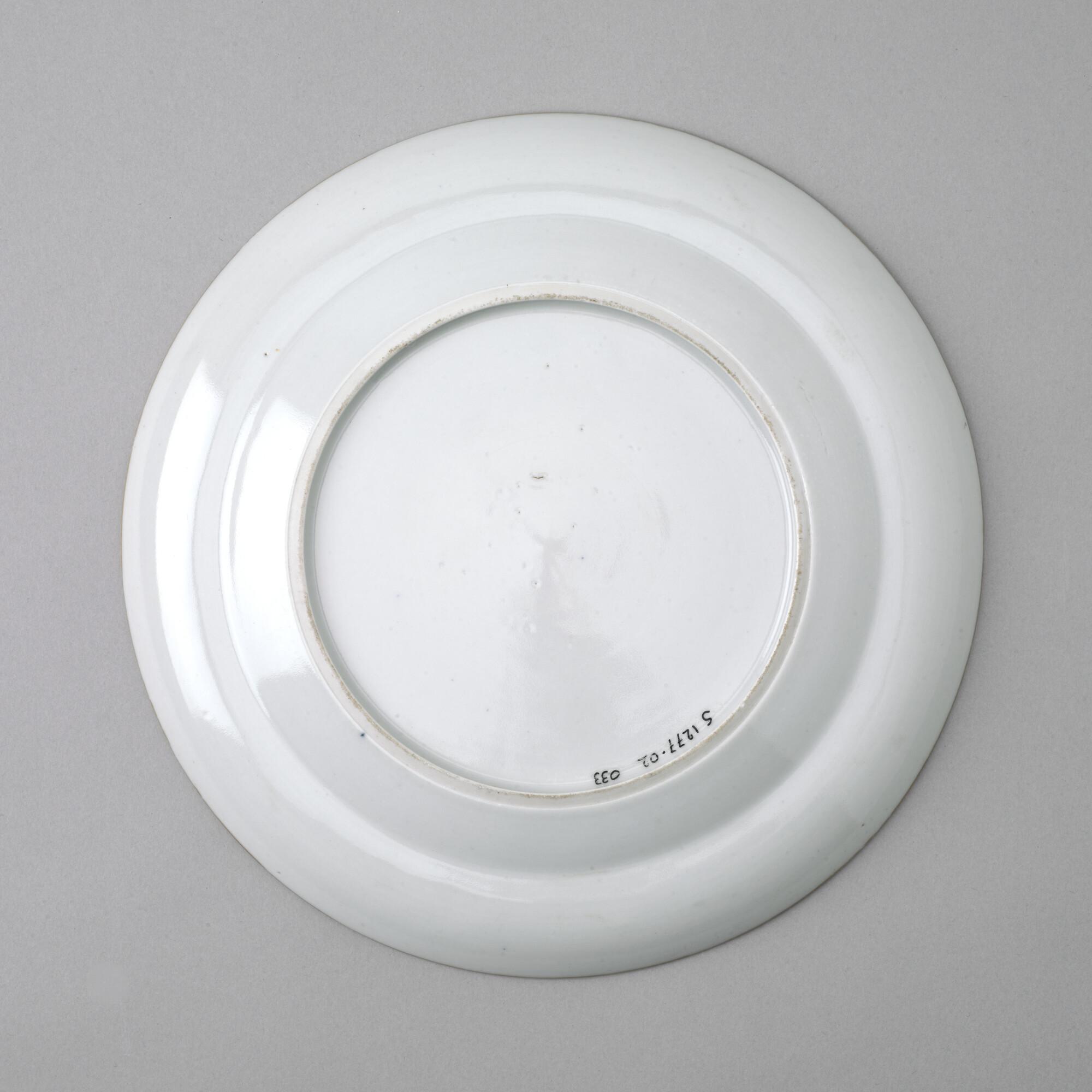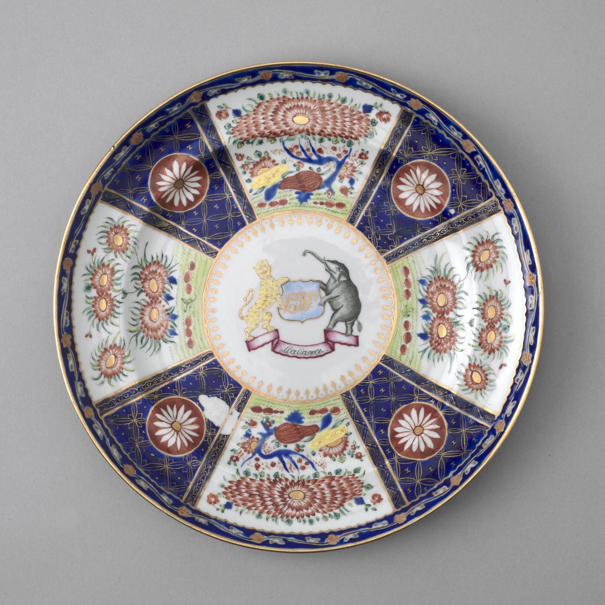 Groot, plat bord van Chinees porselein. Gedecoreerd met een polychroom wapenschild gedragen door een tijger en een olifant. In het wapenschild het monogram "CJW" en daaronder het opschrift "Malacca".