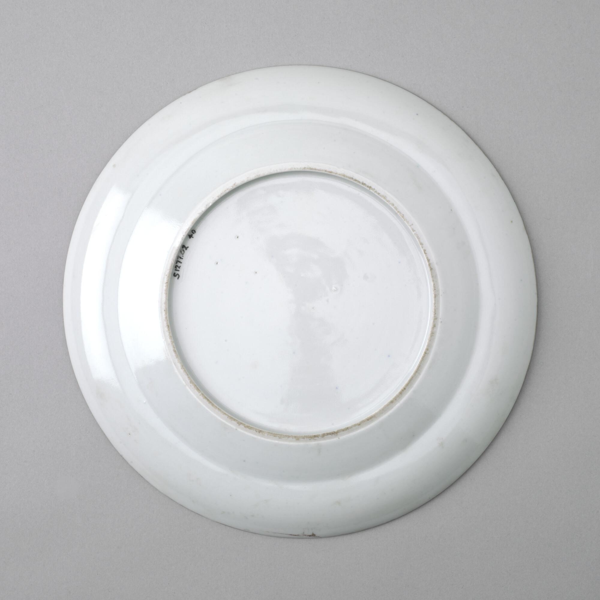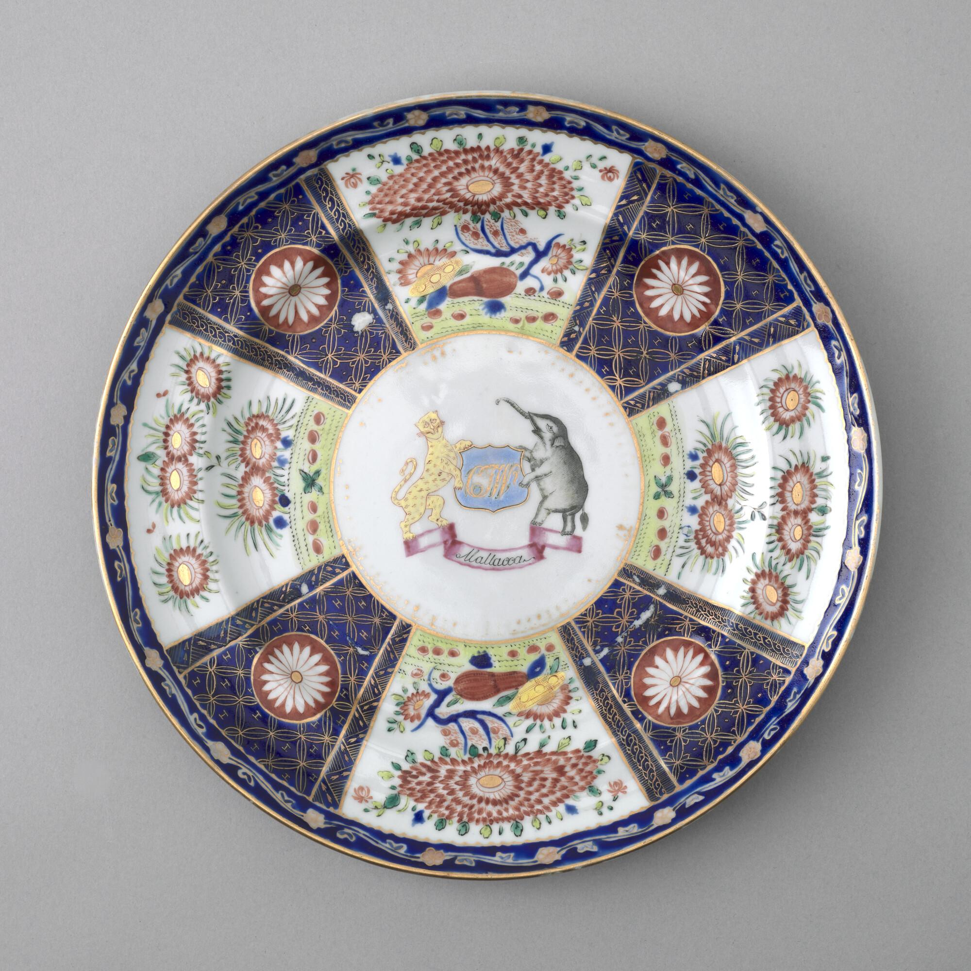 Groot, plat bord van Chinees porselein. Gedecoreerd met een polychroom wapenschild gedragen door een tijger en een olifant. In het wapenschild het monogram "CJW" en daaronder het opschrift "Malacca".