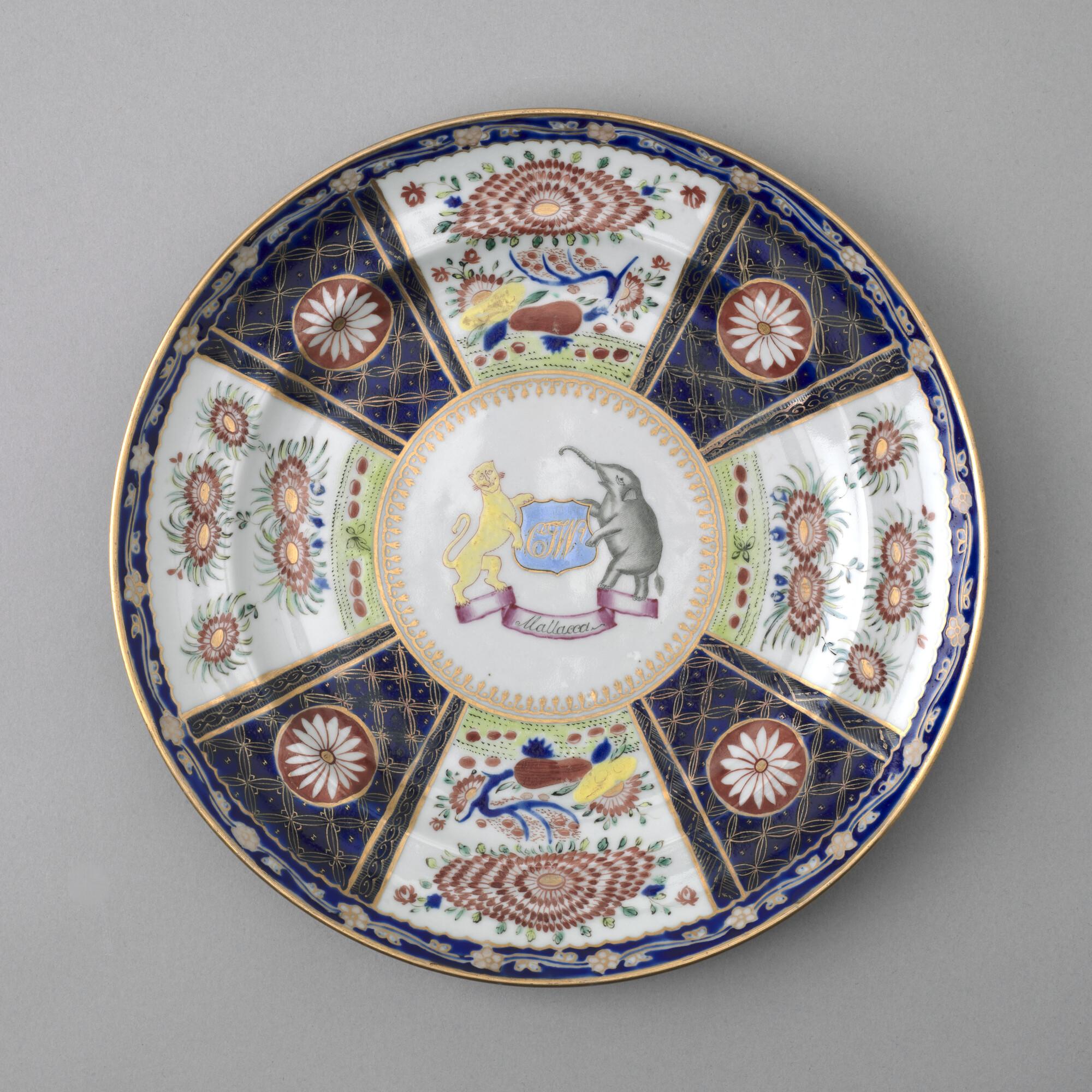 Groot, plat bord van Chinees porselein. Gedecoreerd met een polychroom wapenschild gedragen door een tijger en een olifant. In het wapenschild het monogram "CJW" en daaronder het opschrift "Malacca".
