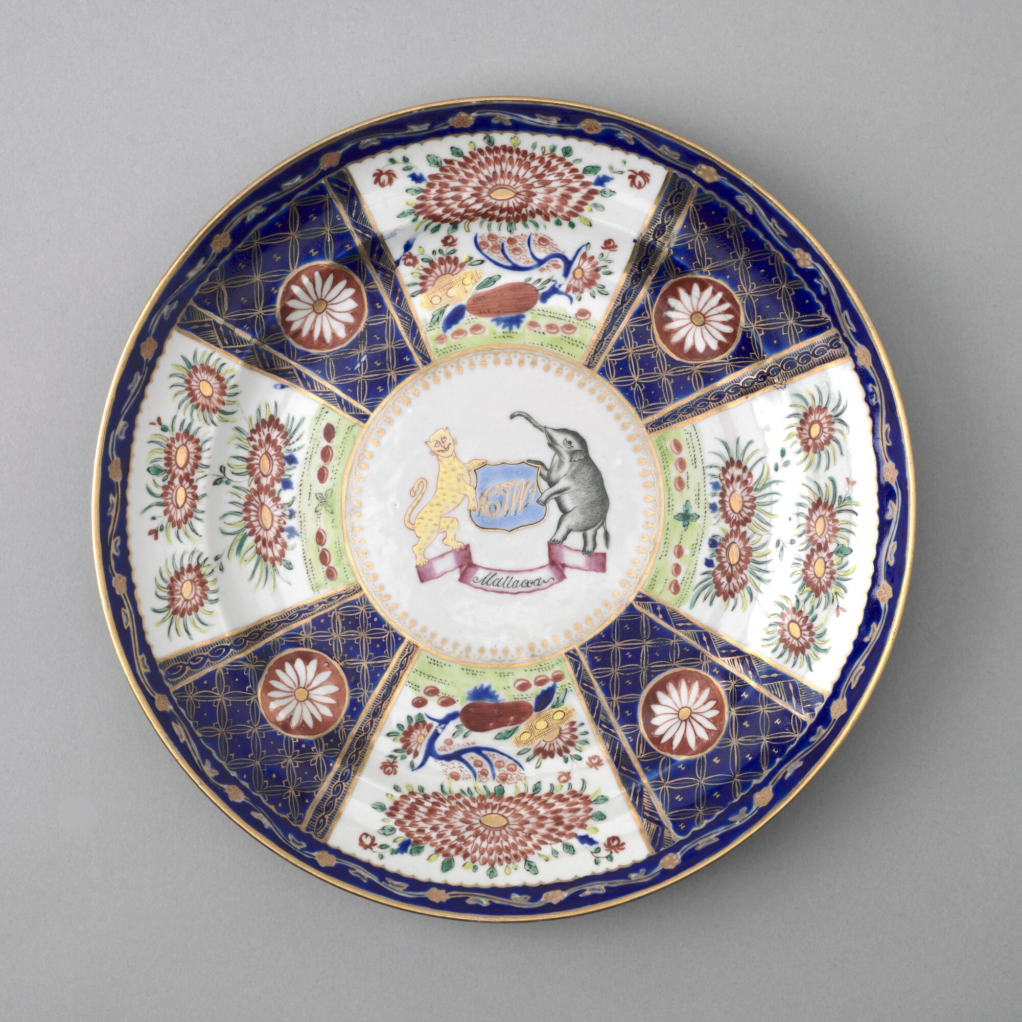 Groot, plat bord van Chinees porselein. Gedecoreerd met een polychroom wapenschild gedragen door een tijger en een olifant. In het wapenschild het monogram "CJW" en daaronder het opschrift "Malacca".