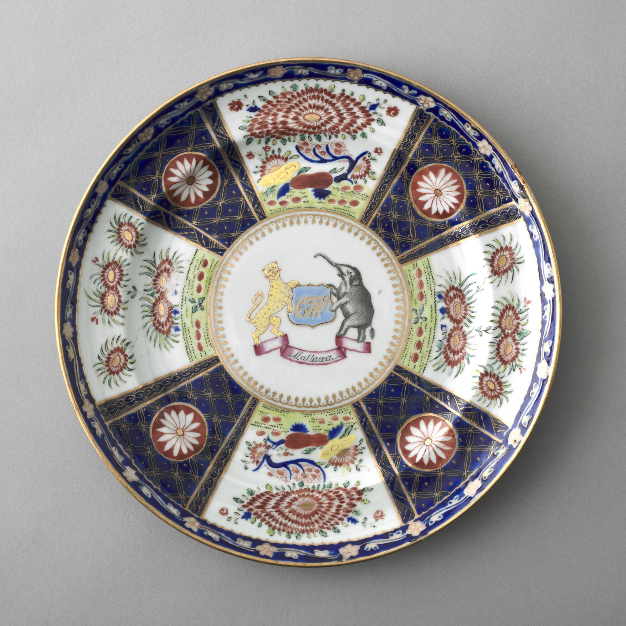 Groot, plat bord van Chinees porselein. Gedecoreerd met een polychroom wapenschild gedragen door een tijger en een olifant. In het wapenschild het monogram "CJW" en daaronder het opschrift "Malacca".