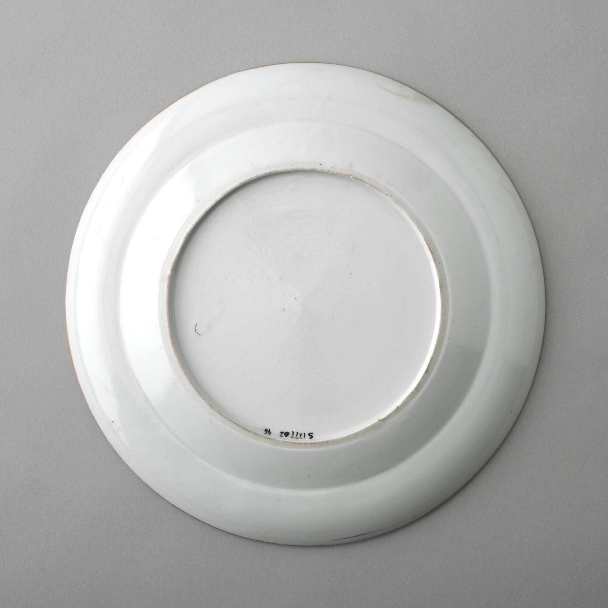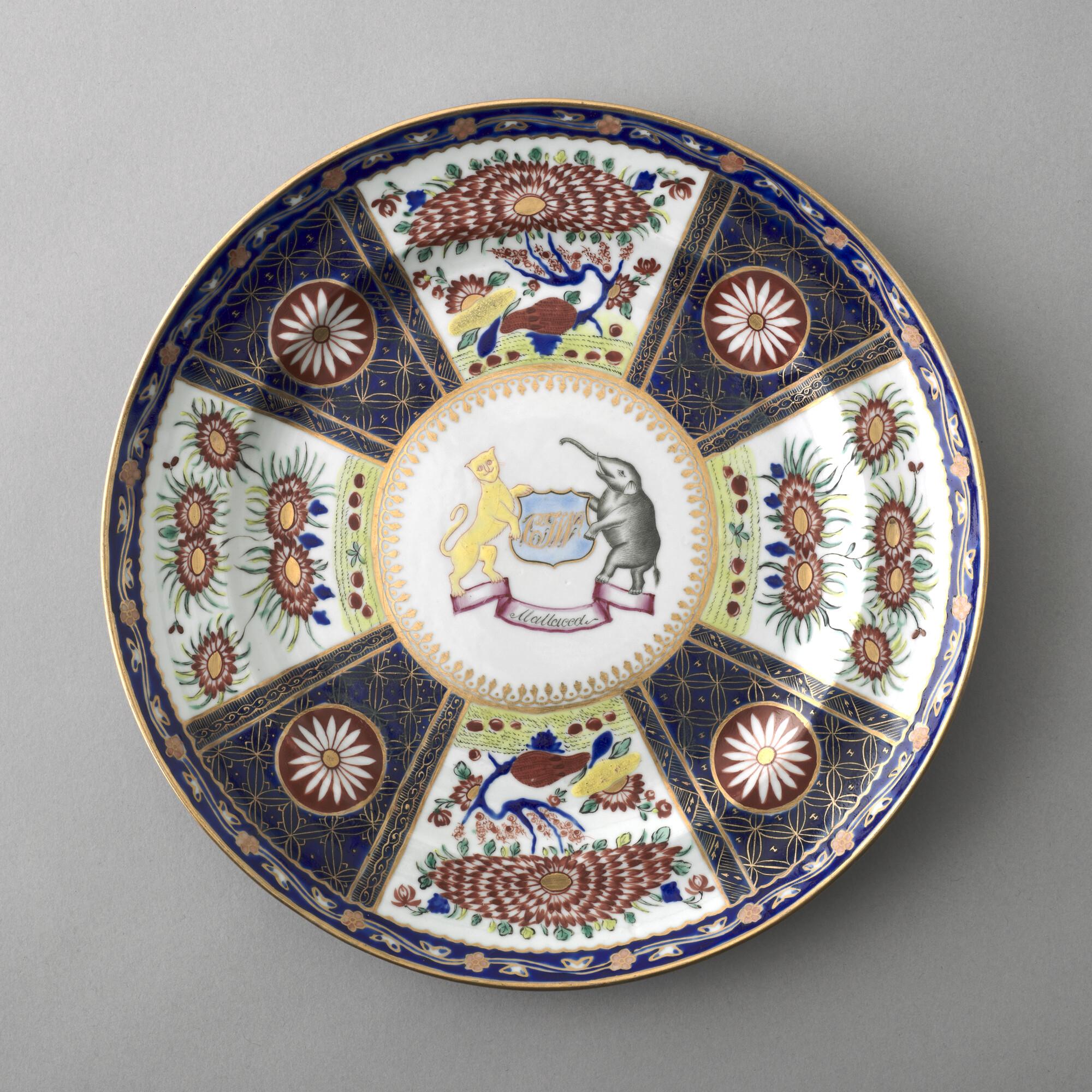Groot, plat bord van Chinees porselein. Gedecoreerd met een polychroom wapenschild gedragen door een tijger en een olifant. In het wapenschild het monogram "CJW" en daaronder het opschrift "Malacca".