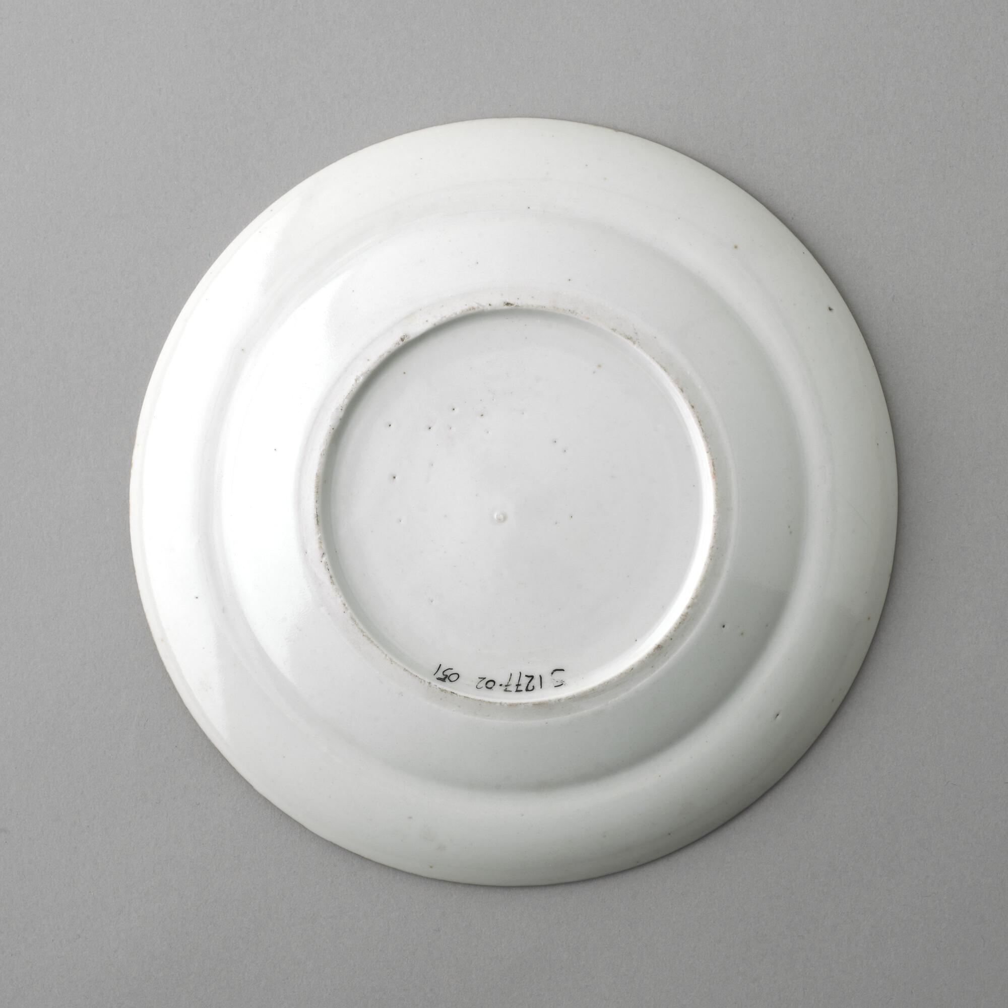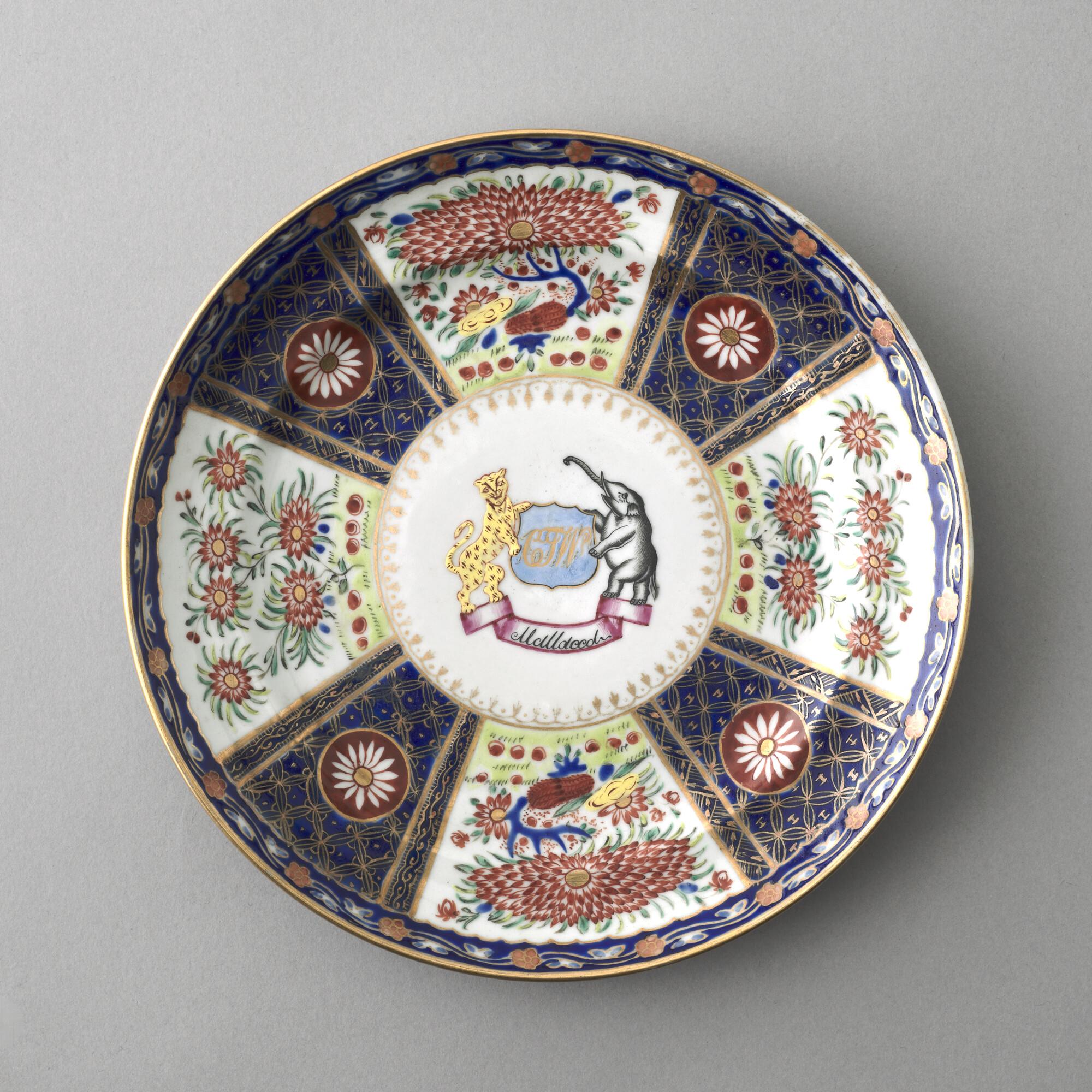 Plat bord van Chinees porselein. Gedecoreerd met een polychroom wapenschild gedragen door een tijger en een olifant. In het wapenschild het monogram "CJW" en daaronder het opschrift "Malacca".