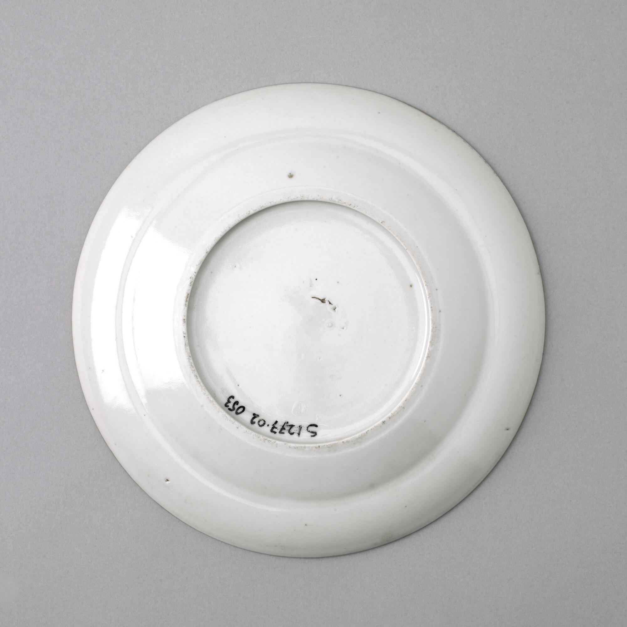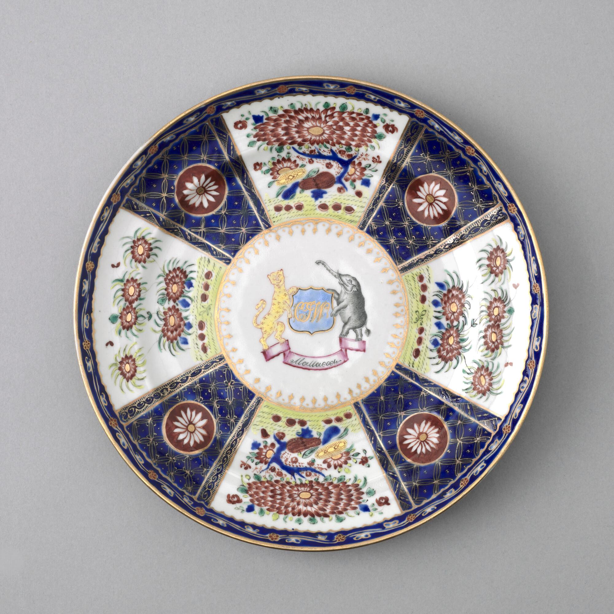 Plat bord van Chinees porselein. Gedecoreerd met een polychroom wapenschild gedragen door een tijger en een olifant. In het wapenschild het monogram "CJW" en daaronder het opschrift "Malacca".