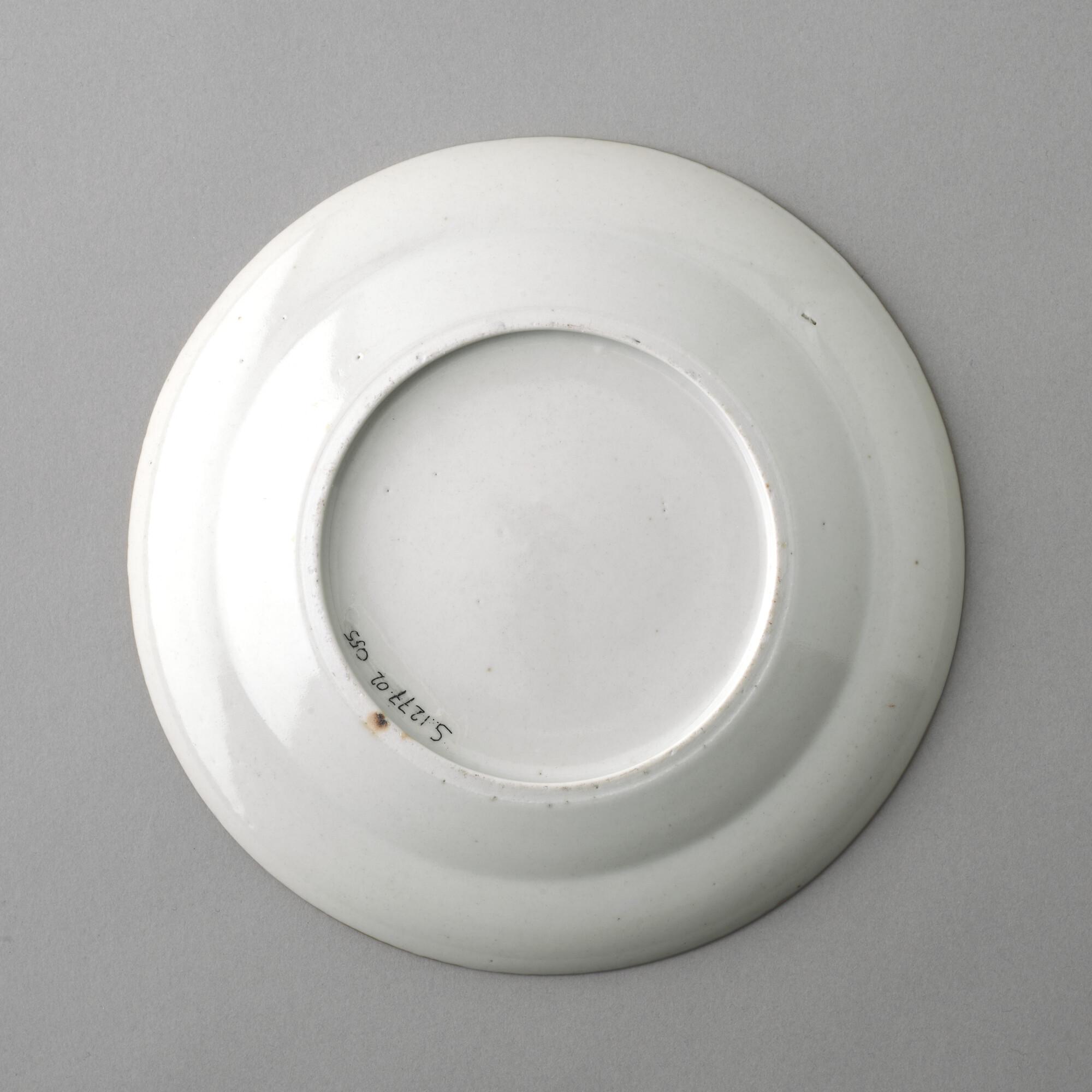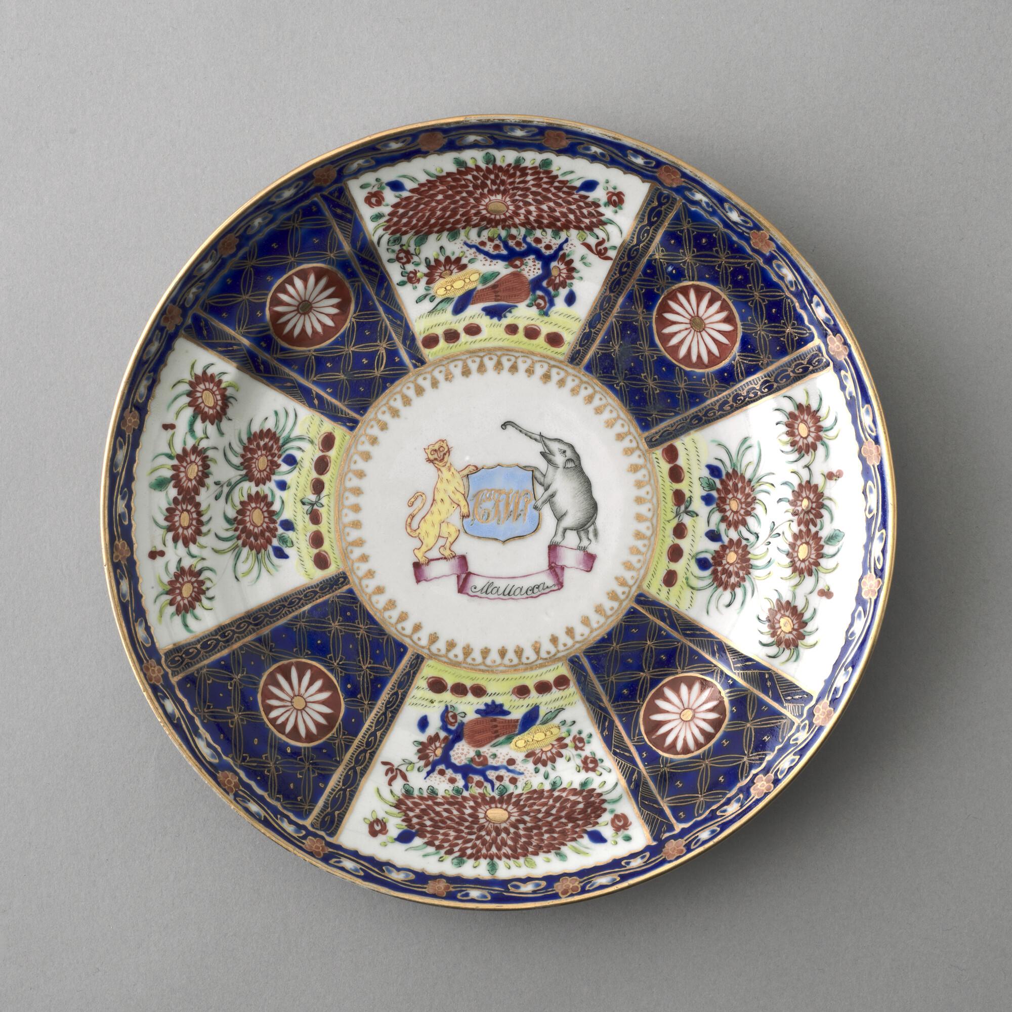 Plat bord van Chinees porselein. Gedecoreerd met een polychroom wapenschild gedragen door een tijger en een olifant. In het wapenschild het monogram "CJW" en daaronder het opschrift "Malacca".