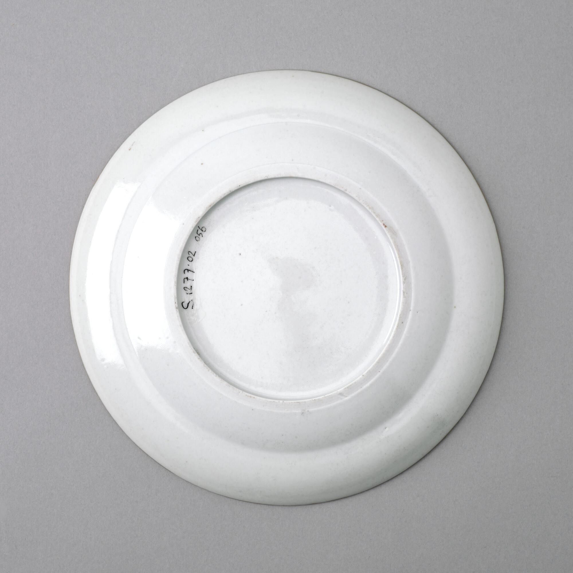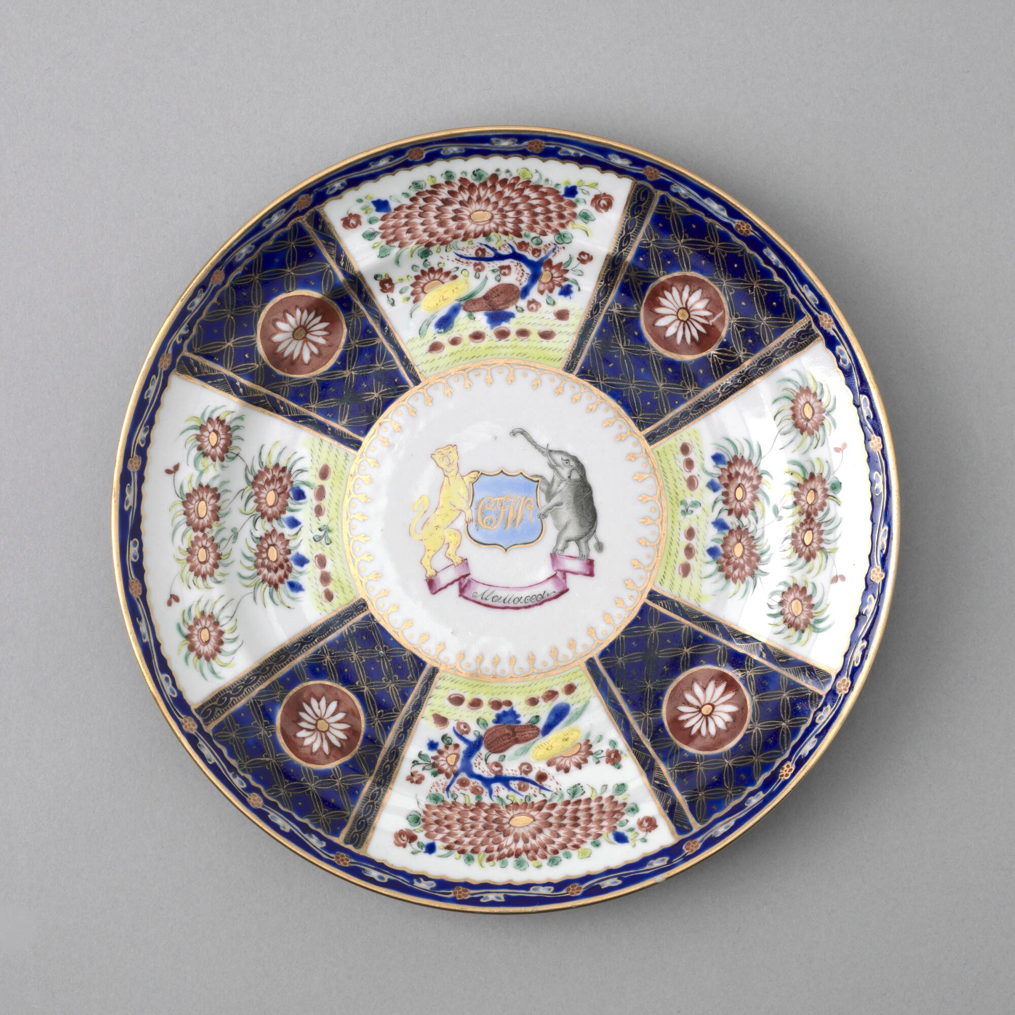Plat bord van Chinees porselein. Gedecoreerd met een polychroom wapenschild gedragen door een tijger en een olifant. In het wapenschild het monogram "CJW" en daaronder het opschrift "Malacca".