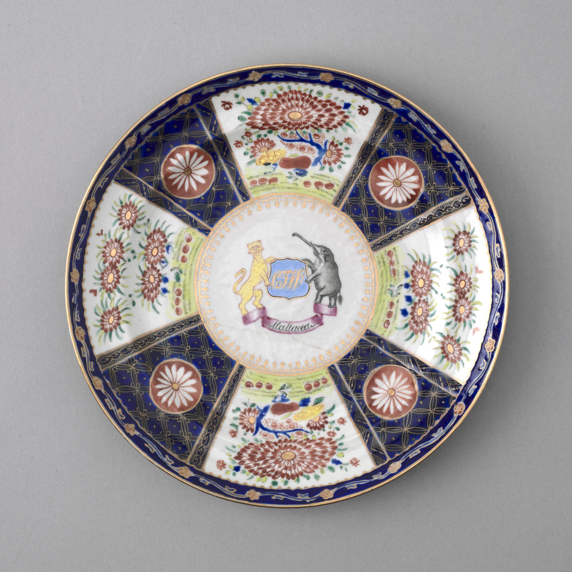 Plat bord van Chinees porselein. Gedecoreerd met een polychroom wapenschild gedragen door een tijger en een olifant. In het wapenschild het monogram "CJW" en daaronder het opschrift "Malacca".