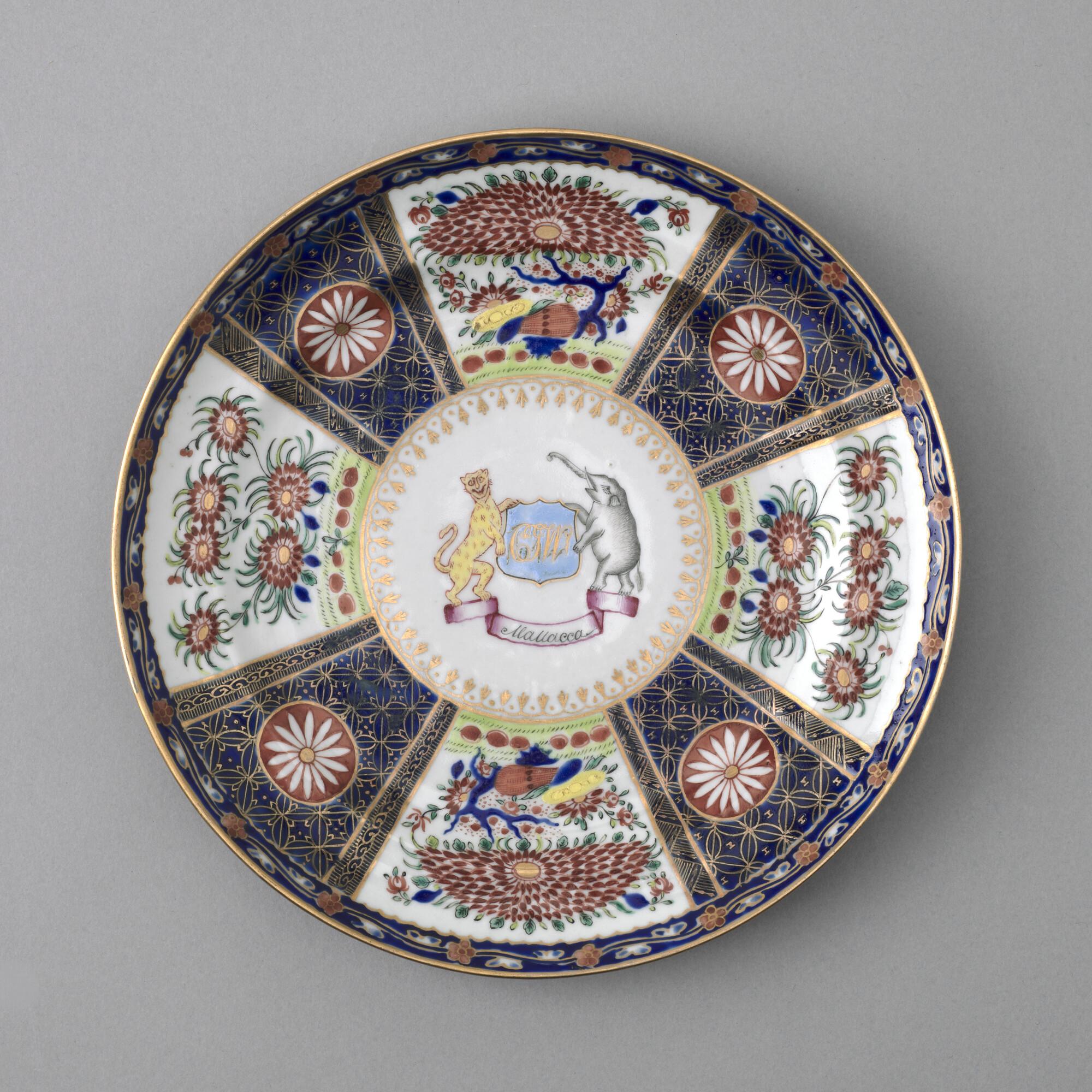 Plat bord van Chinees porselein. Gedecoreerd met een polychroom wapenschild gedragen door een tijger en een olifant. In het wapenschild het monogram "CJW" en daaronder het opschrift "Malacca".